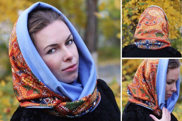 - short - such accessories from afar look like a wide collar, are made of warm materials, fit to the neck, can be decorated; minus - they can not be worn on the head;
