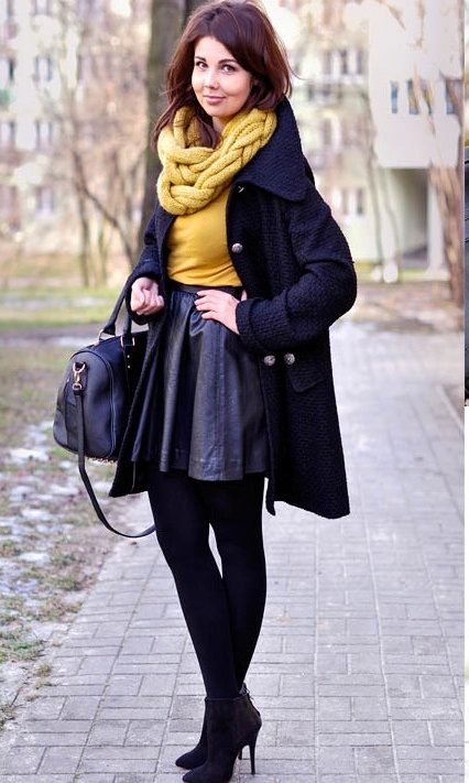 The first image is a classic combination of black lace with a feminine set. The girl is dressed in a short skirt-sun, black stylish leather jacket and sweater fine knit. Naturally, she wanted to warm the set, since the action obviously takes place in the fall or spring. The collar in this case performs two functions at once: it really protects from the cold, and also complements the outfit, in some way overlapping with the pattern on the jacket.