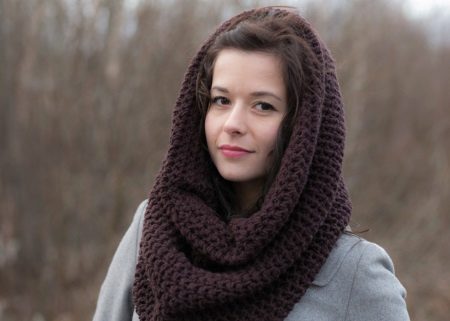 - The classic - everyday way to operate a boat is to wrap it around your neck several times, making a cross. Depending on the size and material of the product, either a tight-fitting scarf or a cascade of fabric going down to the chest with an orientation point in the center can be obtained. From the second position it is convenient to lift the collar to form a hood that is put on the head. The first option will simply protect your neck from the wind.