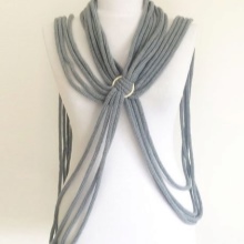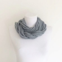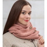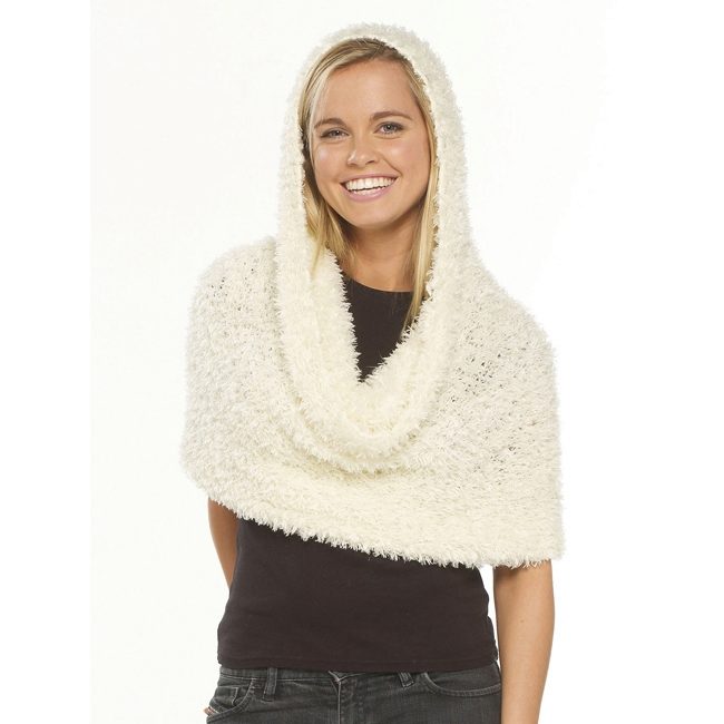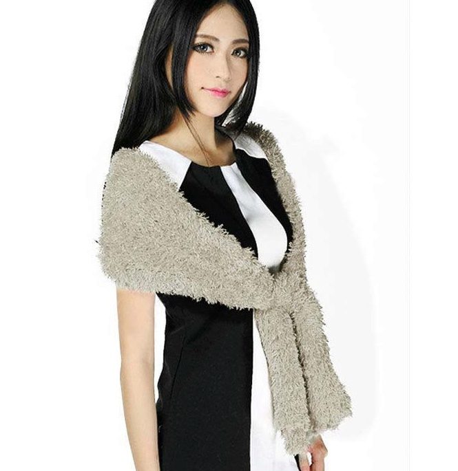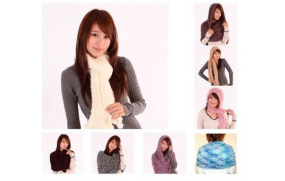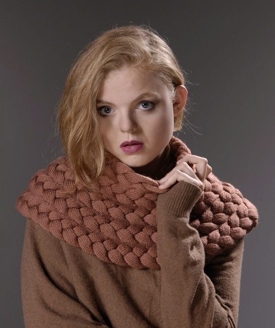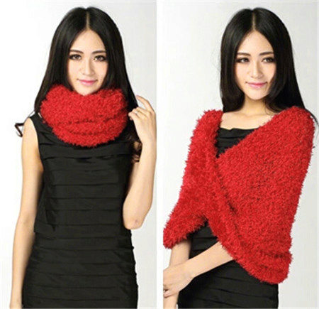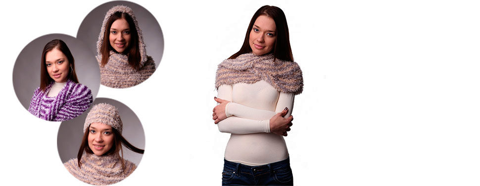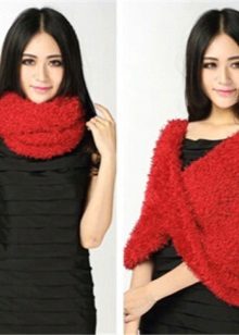 Under the name of a transforming scarf in the Russian market, the models of snoods from fluffy yarn “weed” of Chinese production are widely represented. Soft, very voluminous, often with a shedding pile of acrylic of low quality. They are sold on the Ali-express website, in the Oriflame catalog and on the shelves of mass-market stores. Very warm, they are simple and unpretentious in the care. Easily pulled in all directions due to the loose structure and do not hold the form. As a result, they can be a scarf, a cape, and a dress. They lose density when stretched, so the dress from such a scarf may turn out to be translucent.