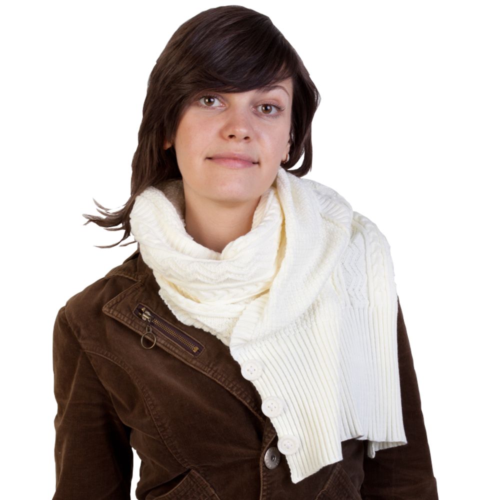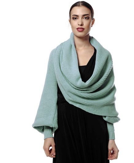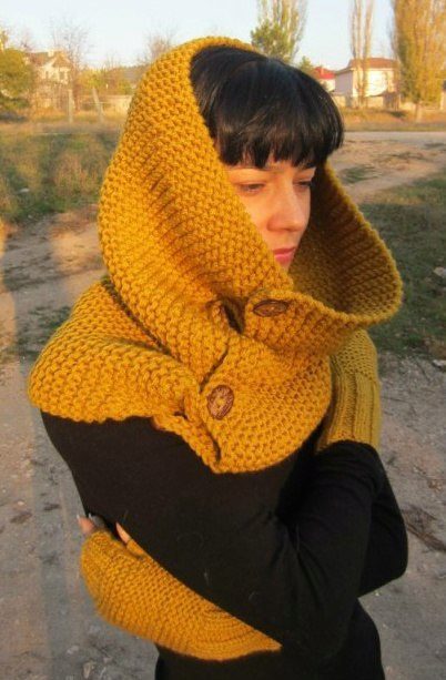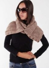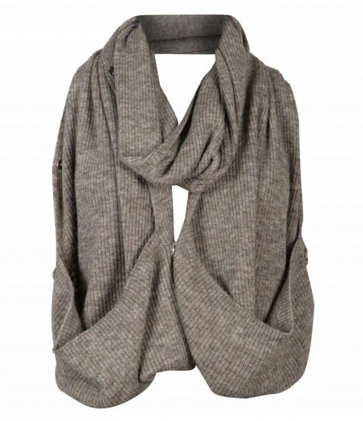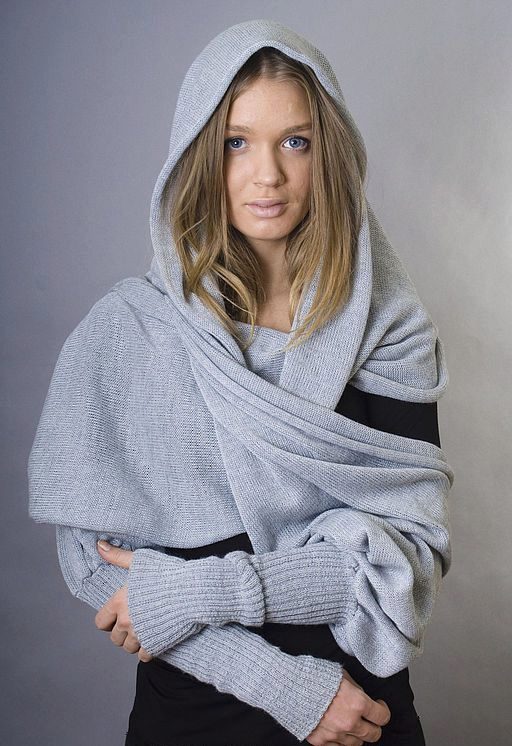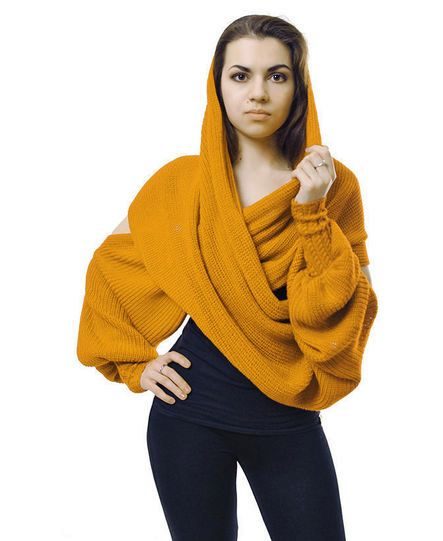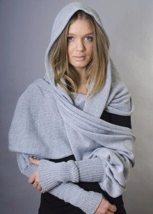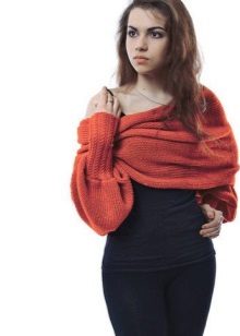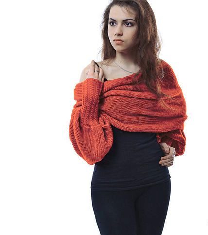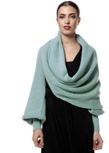 The transforming scarf can be made of knitwear, both factory-made and hand-knitted. More often, such scarves are knitted with needles, since crocheted fabric is less plastic. Who is suitable? Laconic models of a scarf-vest and a scarf with sleeves are suitable for an office with a non-strict dress code. Such a thing will save from the cold air of the air conditioner, warm if you are frozen on the way to work. It will be pleasant to wrap the frozen arms and shoulders in soft folds, or to wrap a warm scarf around the neck.