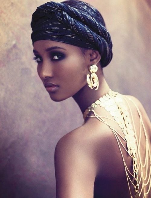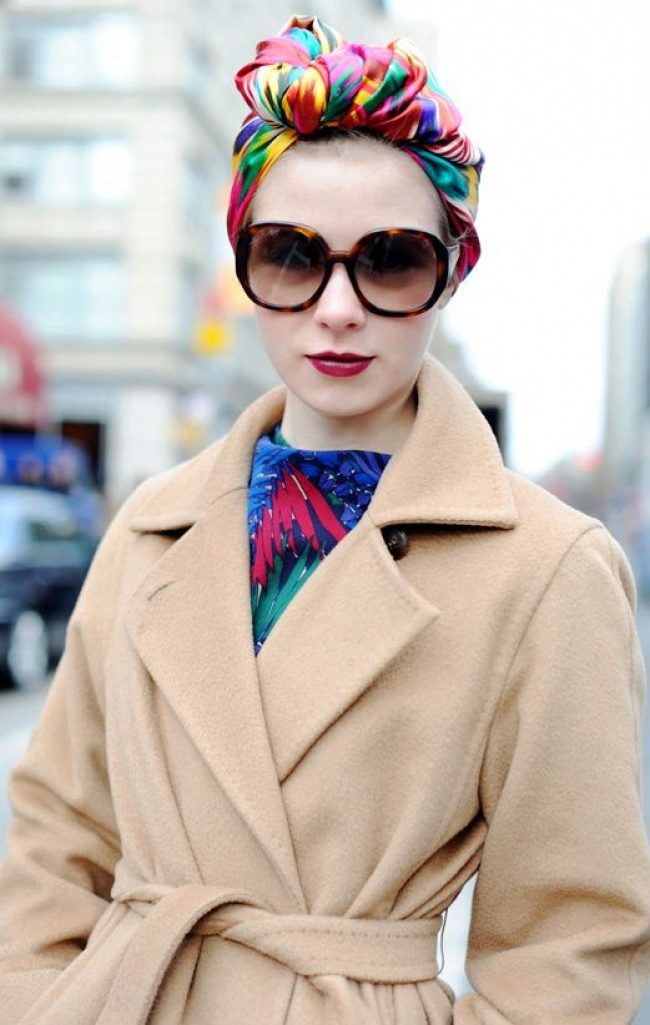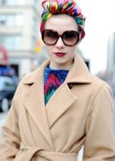 Another option to wear a scarf of cords - tie it on his head. A voluminous bandage will warm and hold the hair in windy weather. As a headdress, you can use the simplest scarf, if you tie it in a turban. Turban returns to fashion with enviable regularity - it was popular both in the 40s and in the 70s of the 20th century. Now this headdress can be found on the red carpet, on the street and on the beach. Not spared, and stylization, so characteristic of modern fashion. Began to appear wide bandages a la turban, which can also be easily made from a scarf.