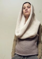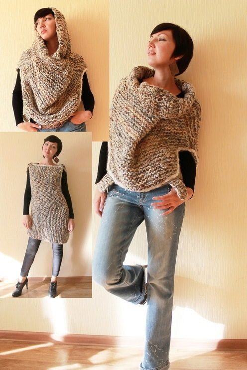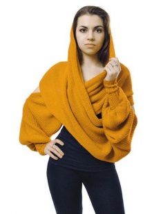 There are also very interesting transforming dreams, made from high-quality yarn, combining fibers of mohair and silk or very fine merino wool. They are soft, weightless, drape well, warm. Pass air. They are not hot in the room. Such a thing can replace a scarf, hat, cape, poncho, tunic. They do not have excessive plasticity, but rather thin, which gives them the opportunity to become a scarf. Transforming scarf in the form of a pipe allows you to focus on the waist and demonstrate wide belts, corsets, or draw attention to the shoulders, try on a large bright brooch.