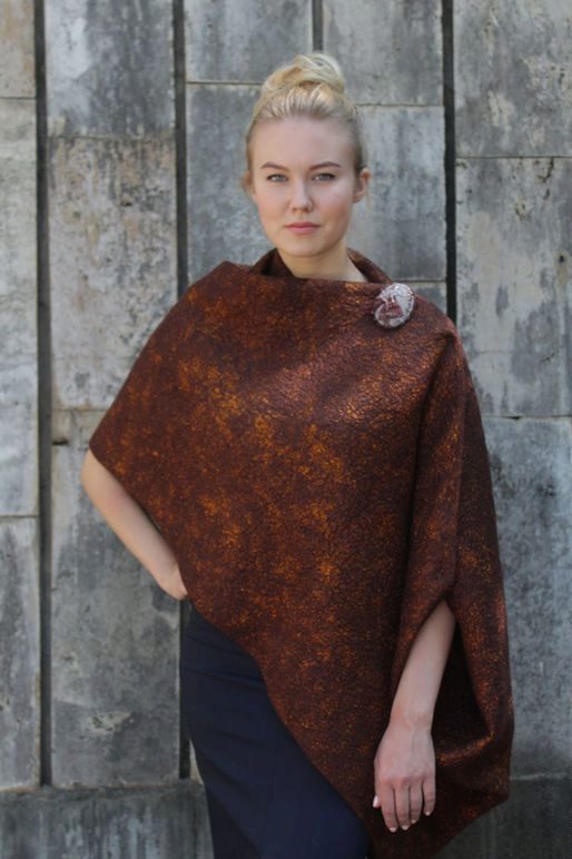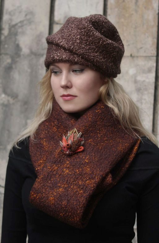 Elegant and exquisite work of Elena Zatonskaya - jacket-scarf-poncho on the base of a pipe scarf, made of felt using the boucle technique. Very interesting thing with an unusual texture, deep colors. The scarf has hidden buttons.