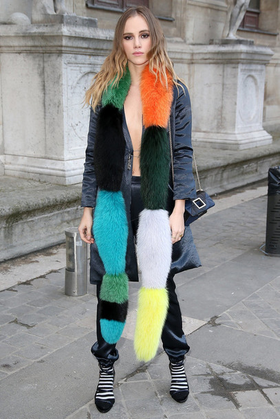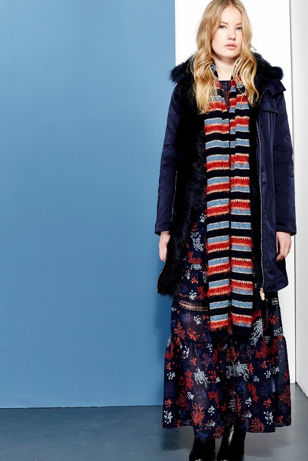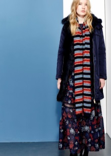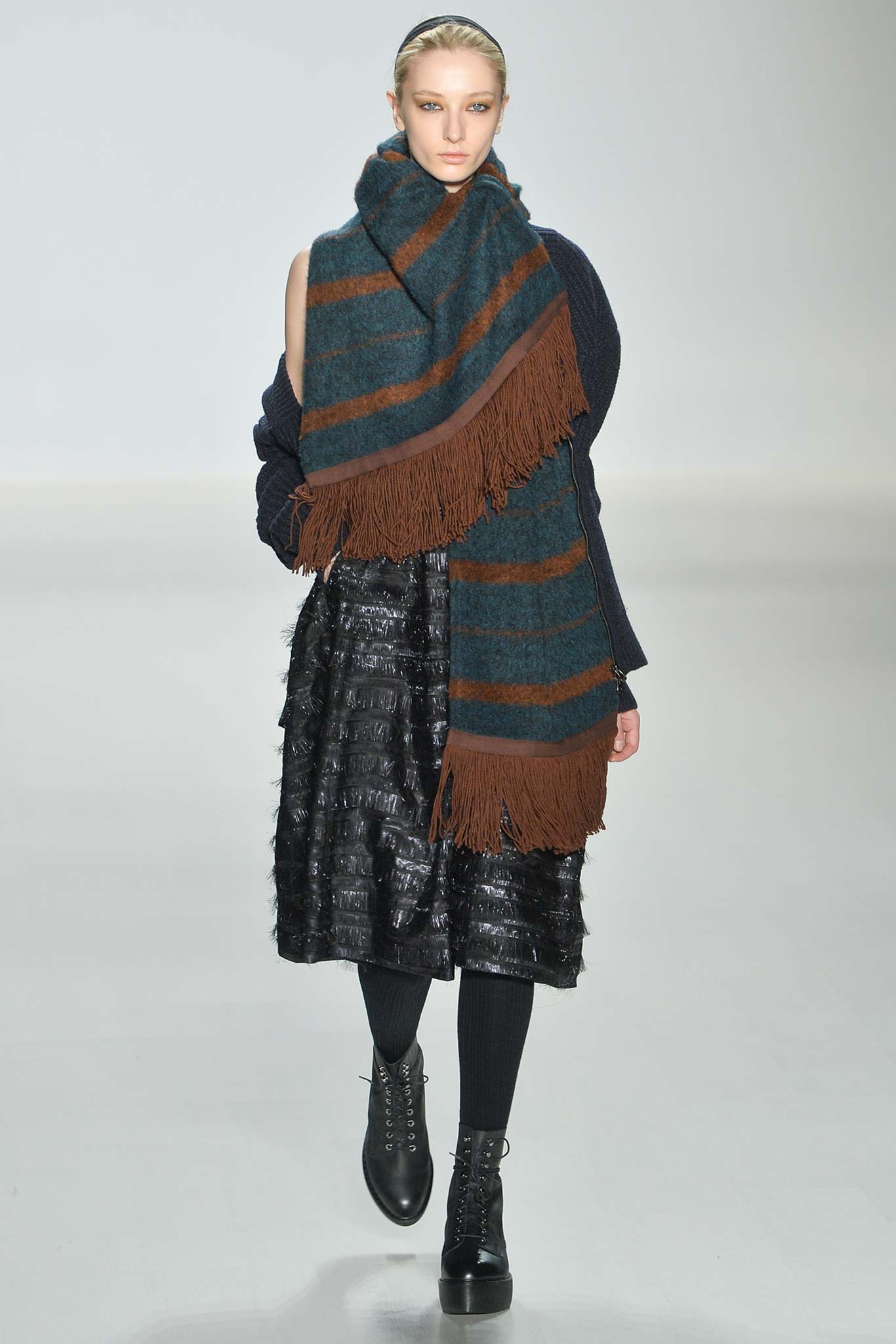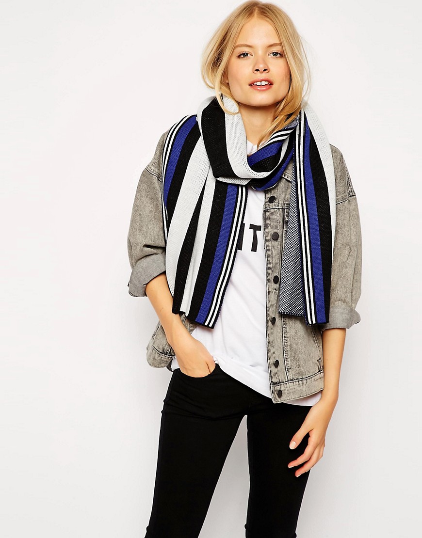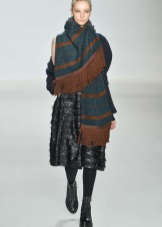 Today, the strip touched literally all models of a warm accessory: it can be seen both in a strict classical ensemble, and in a playful romantic set, sports, and even extravagant. The pattern touched all presented collection rulers: it decorates classics, scarves-pounds, collars, hoods, scarves-ponchos, plaids.