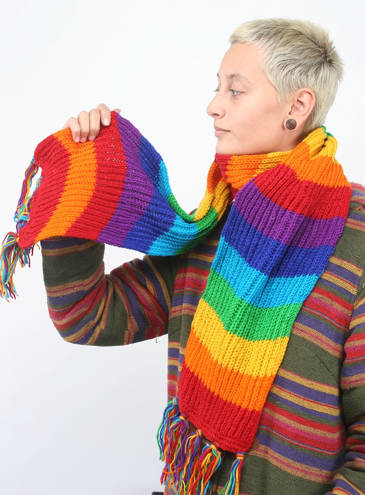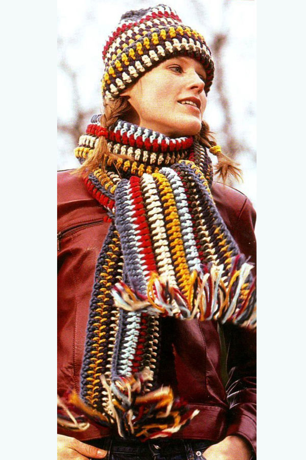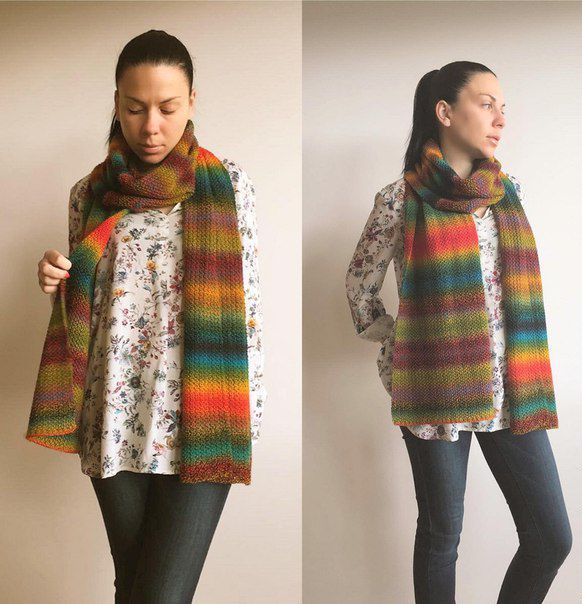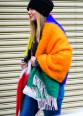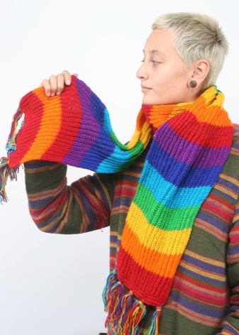 Textured knitting of several colors gives the model a unique and special charm. Along the edges often the product is decorated with a fringe to match one of the bands. The width of the lines in some variants is quite large and resembles a rectangle. The palette of colors from two to four colors, harmoniously combined with each other.