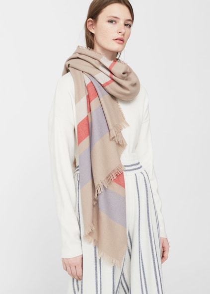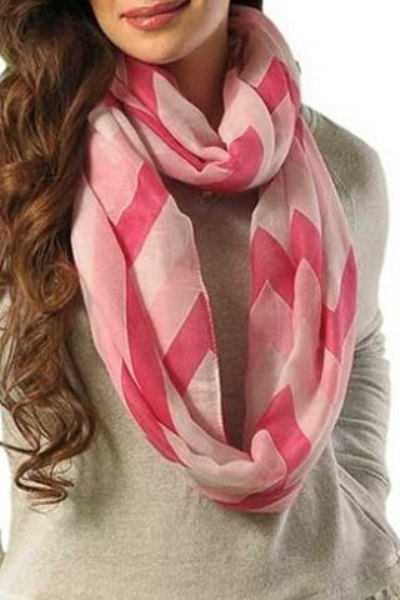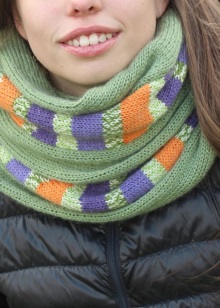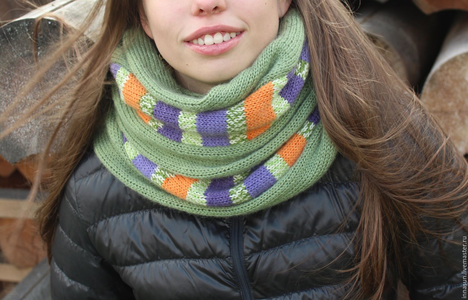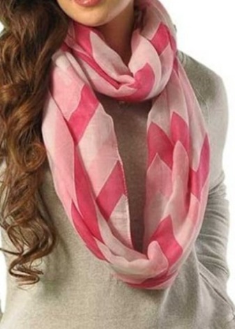 Scarf with English elastic band is perfect for any age. The colorful range of neutral shades (peach-colored, pale coral in combination with gray, black or soft blue) can be called actual everyday design.