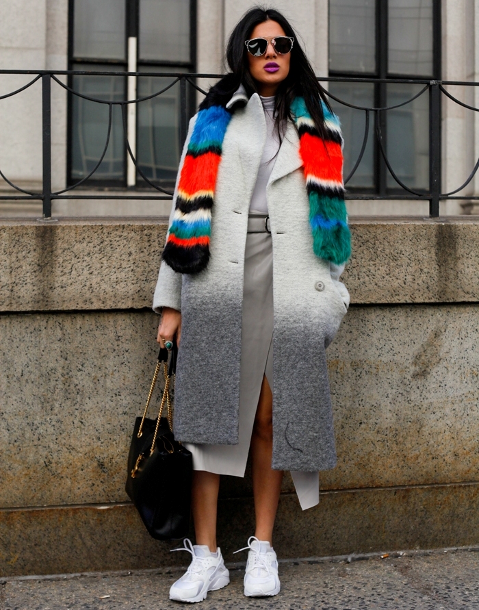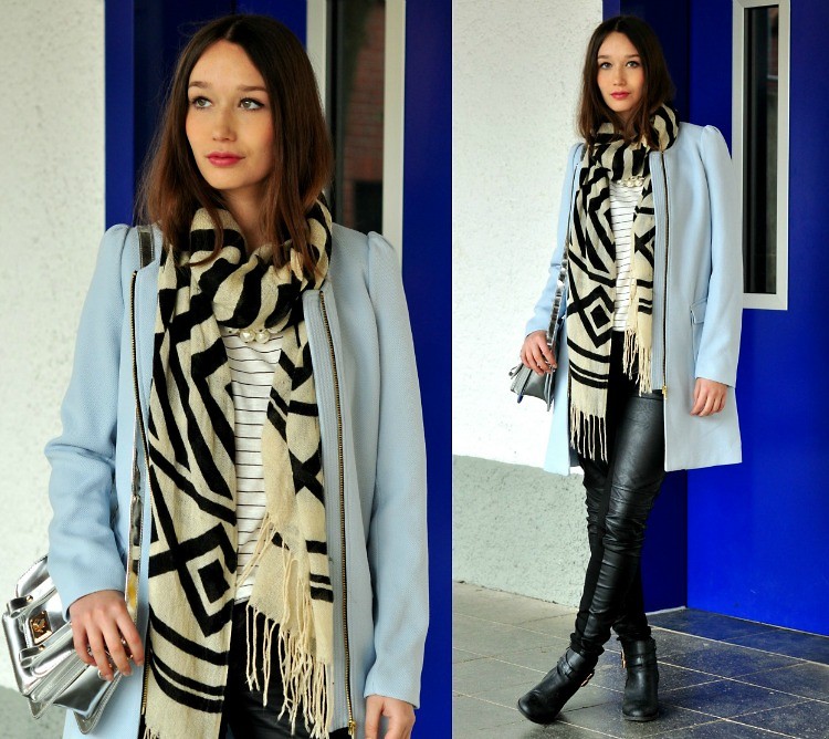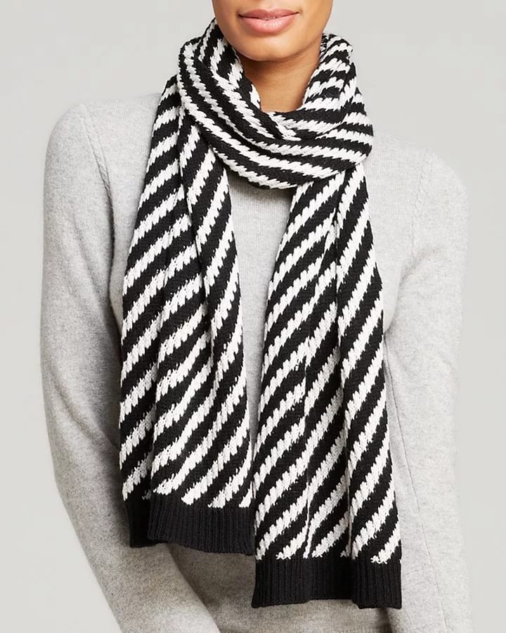 The black and white color combination is perfect for black, gray and white things. A small striped cashmere scarf perfectly complements the business style.