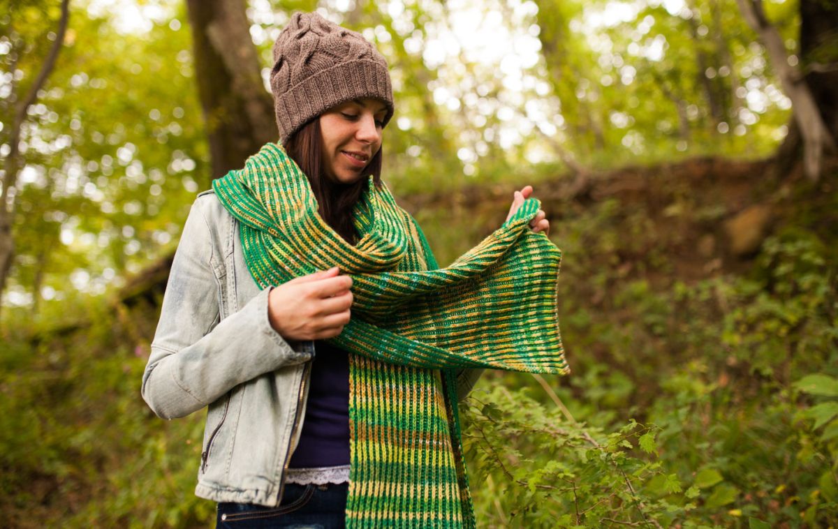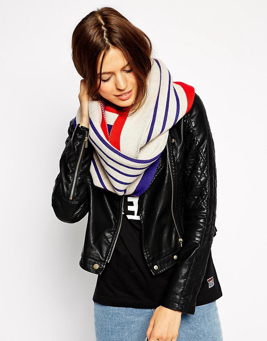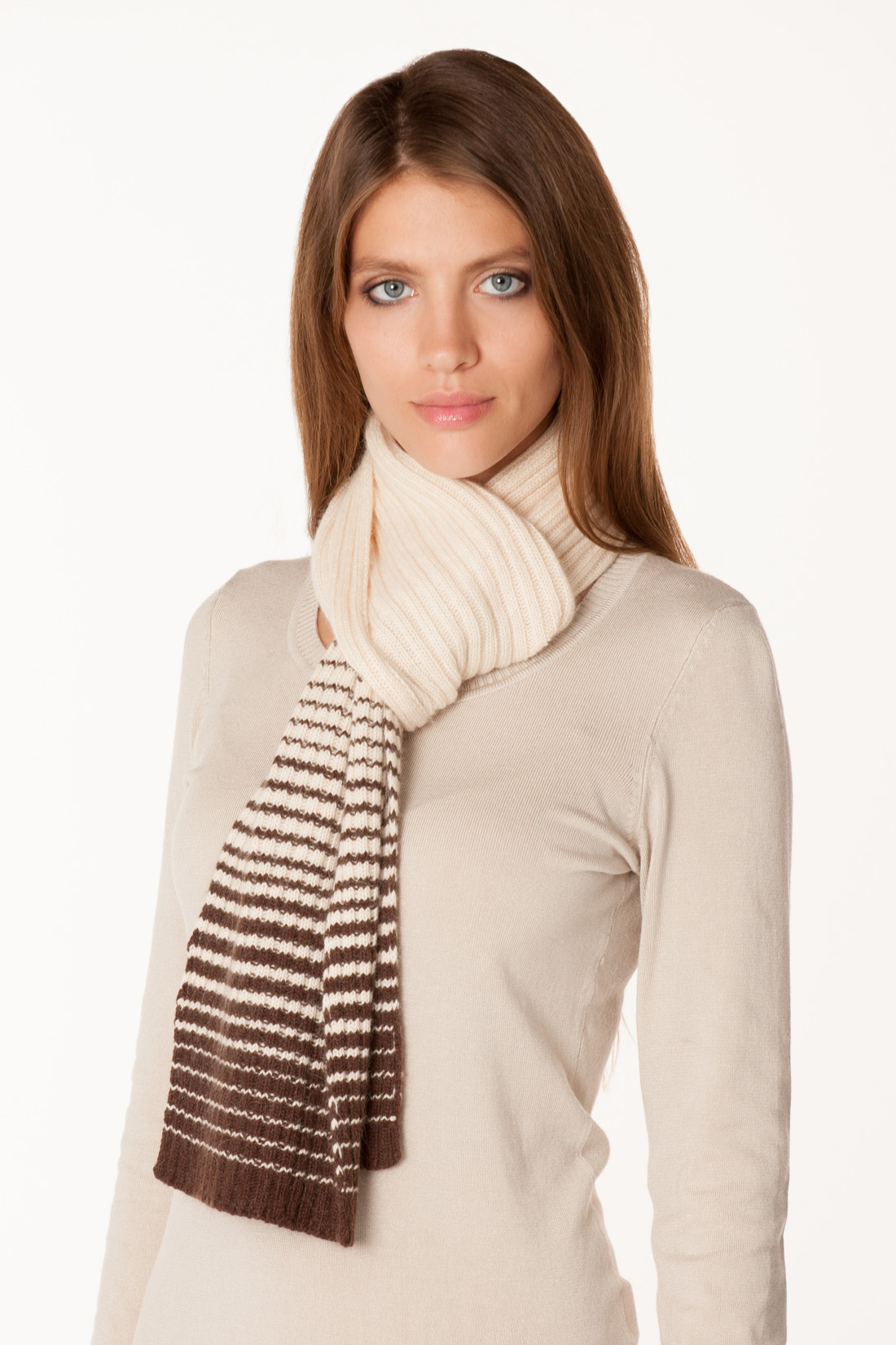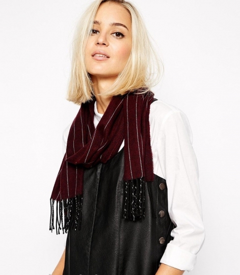Beautiful and graceful looks striped scarf, knitted English elastic. Such an element of the ensemble is always in fashion, design ideas each time give it a novelty. These can be broad lines in a monochrome palette or rich colors. The main advantage of templates is that they are universal and suitable for any selected image.