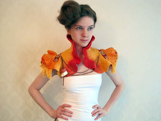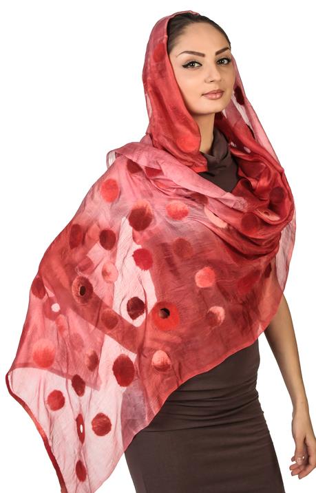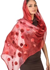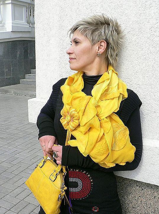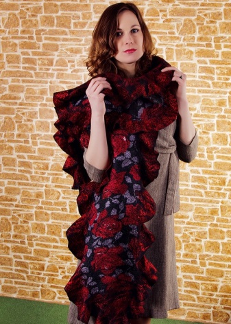 Felted scarf is not just a wardrobe item, but is used for decoration. Do not hide such beauty under the outerwear. Usually stoles are tied over the top of outerwear. Felt scarf is often tied around the neck over the collar. Products from silk usually adorn the neck with an unusual pattern.