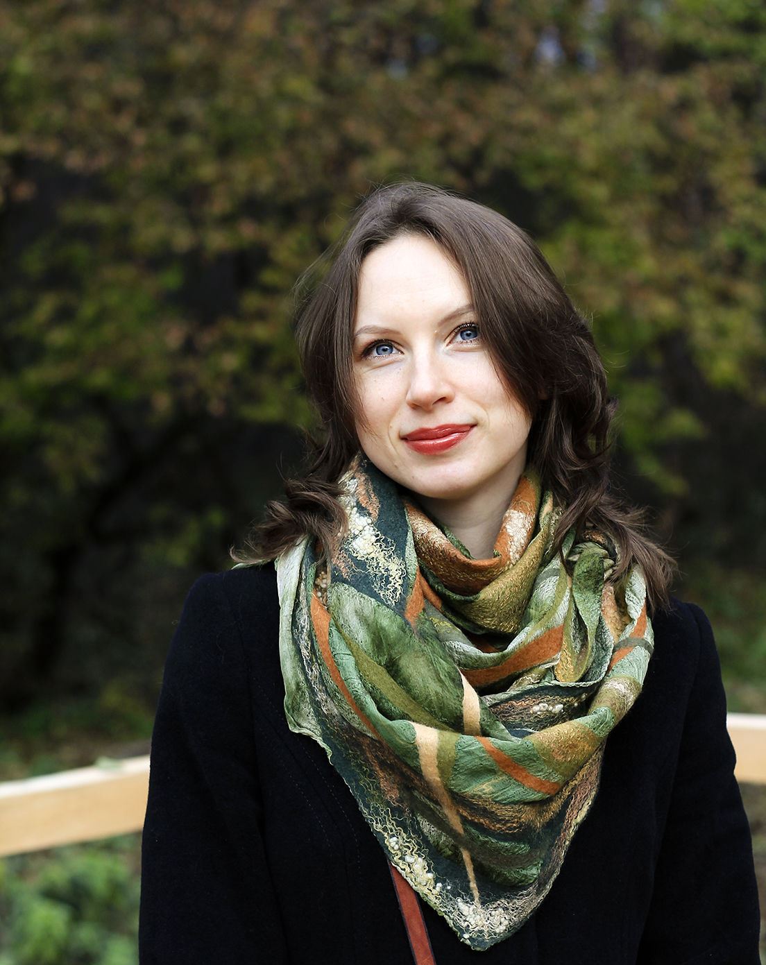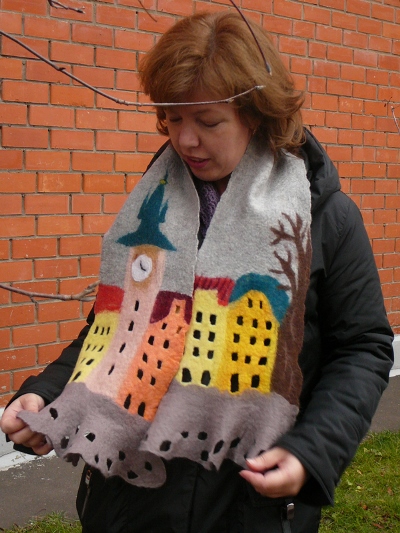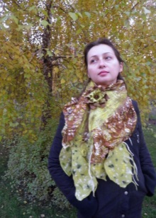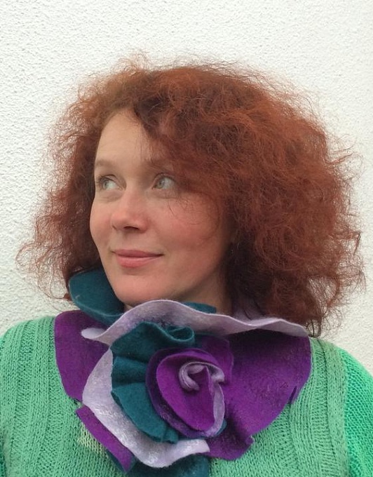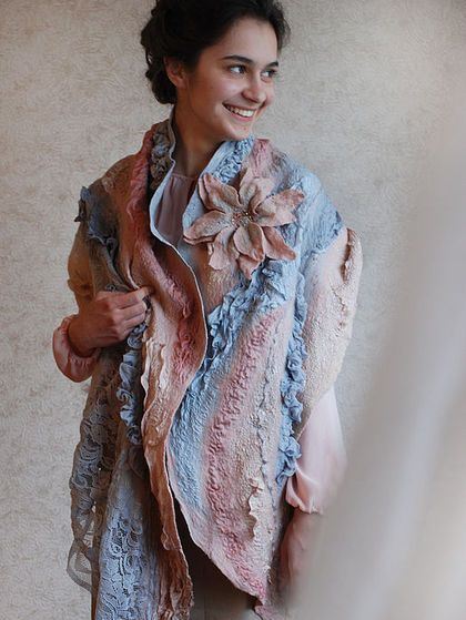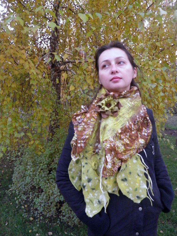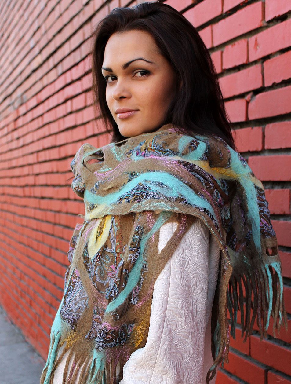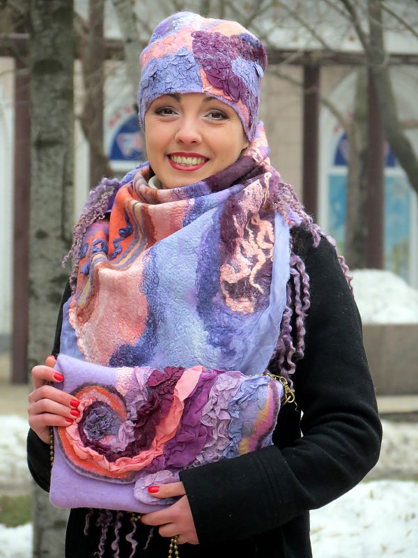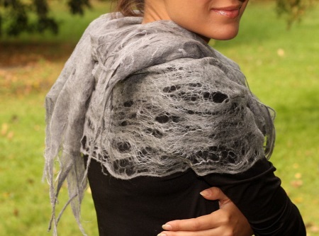 A handmade felted scarf is very elastic and soft. Due to the variety of fibers, you can create models for any season - warm merino wool for winter, demi-season for spring or autumn days and, of course, light and airy from thin silk for hot summer.
