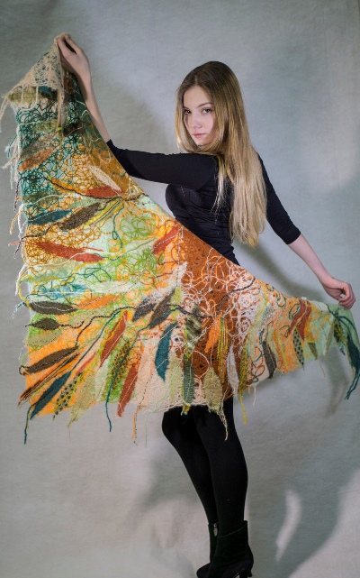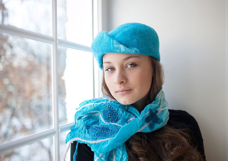 Wet felting allows you to create plain hats and scarves. Using this technique, clothing items are characterized by a soft color transition. A special feature is the tangling of non-spun wool fibers.