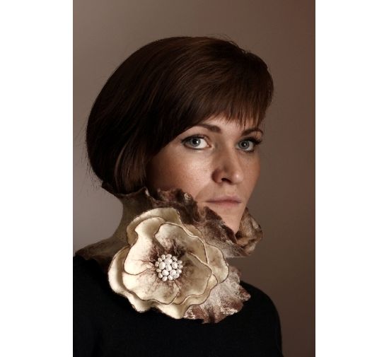 This scarf is made exclusively of wool through the use of wet felting technique. The name "cabbage" product received because of the volume of soft flounces that resemble cabbage leaves. To maintain this shape, designers use additional decorative elements - buttons, hooks, flowers, etc.