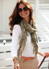 This unique accessory can be used in a thousand variants, everything is limited only by your imagination! A wide enough scarf can be used as a sarong (a strip of fabric wrapped around the waist: author's note). In youth fashion, a thin scarf can be used as a strap on items of underwear. Properly selected in color, a scarf will help to revive the everyday image. But at business meetings or official events a scarf will look very appropriate. For an elegant dress will suit deliberately casually draped scarf around the neck.