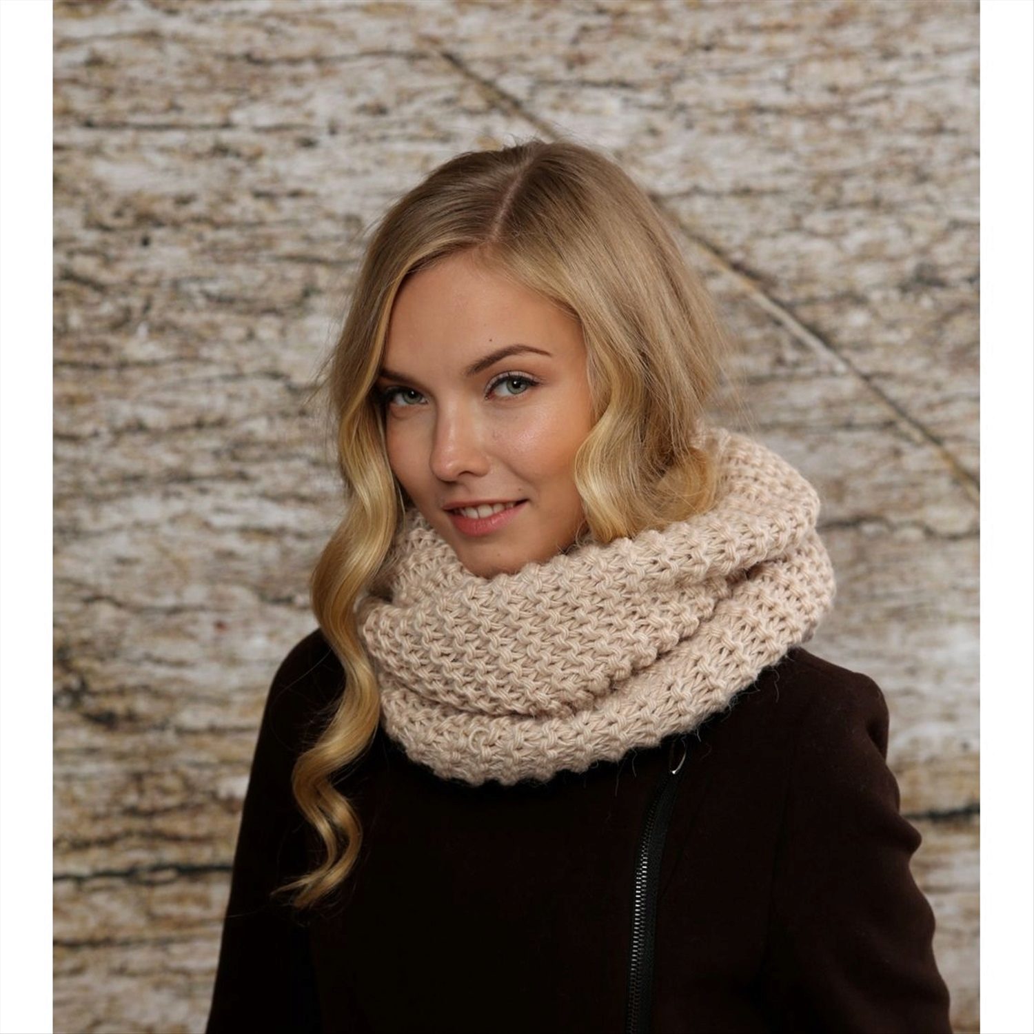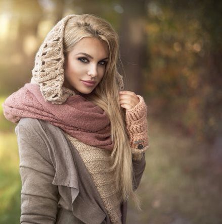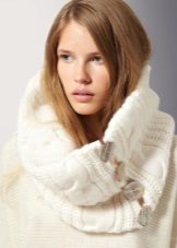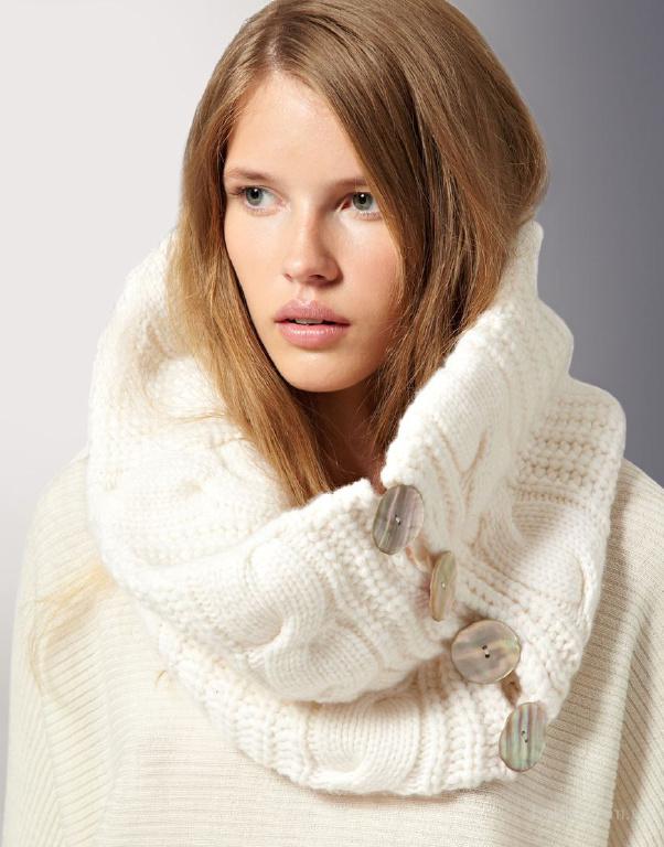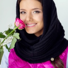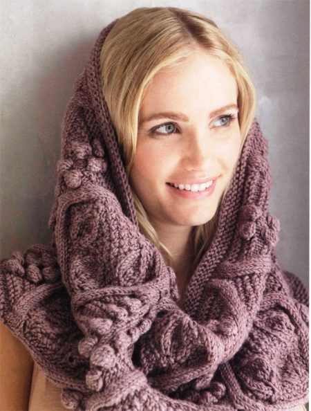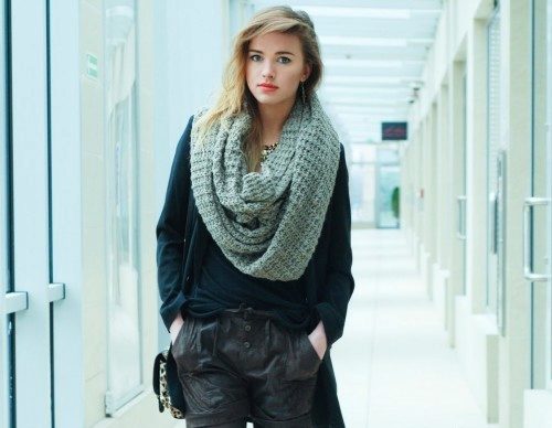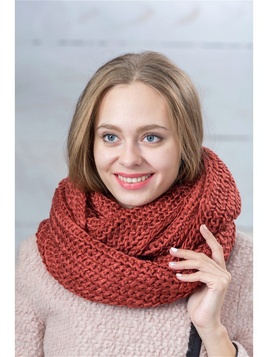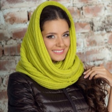 A wide classic snood warm tone is ideal for girls of cold color type. Using various methods you can create many interesting images. Smooth knitting makes it possible to combine a snood with other knitted things.