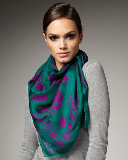 However, with the seasonal selection of a scarf, several more rules must be observed. If the scarf in the winter season is not a kind of home-made rug, but “comes out”, then it is better to choose scarves of bright colors with bold prints, floral motifs and unusual patterns. On a cold evening, a soft woolen shawl will both warm you up and add extravagance to your outfit. In summer, a chiffon or silk scarf, slightly knotted around the neck, is ideal.