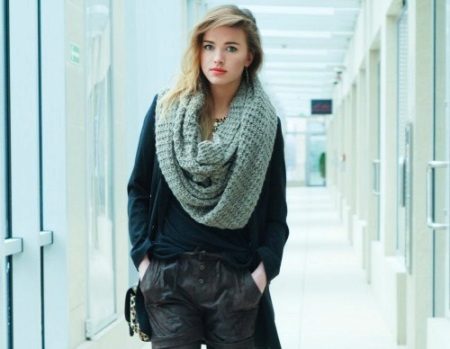 This scarf conquered everyone not only with its unusual appearance, but also with great practicality! Although it is very simple in execution, even a correctly chosen monophonic Lack will dilute the boring image, making it more original.