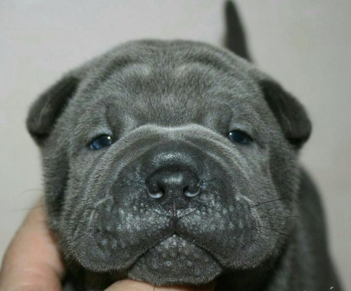 On the face is characterized by the presence of densely located folds. The eyes are small, almond-shaped, have a dark color, look gloomy. The ears are small, dense, triangular, set wide apart. The neck is not long, quite powerful. The body is strong, toned, and puppies are characterized by a large number of folds, which stretch with age, remaining clear only on the face and neck. The blue sharpei hair is short and thick, rather stiff to the touch.