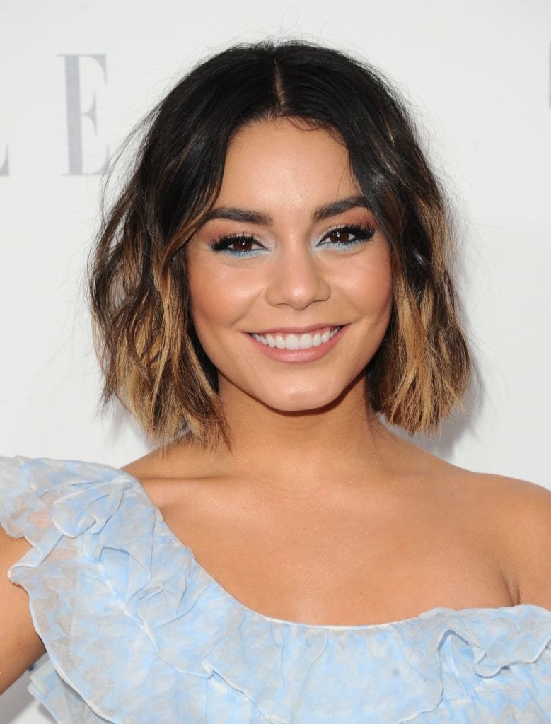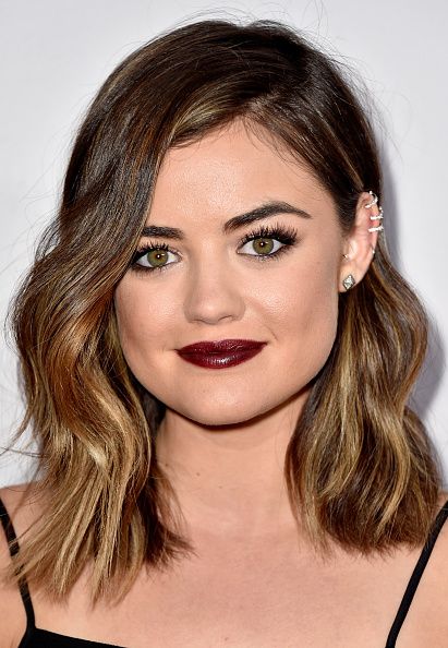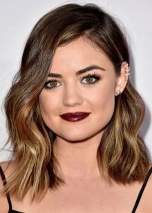 - Shatush on a dark square with lengthening chooses the famous actress Lucy Hale. The golden shade of blond at the ends of the hair perfectly harmonizes with her green eye color.