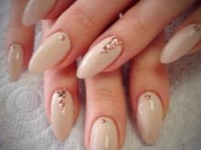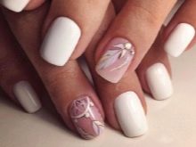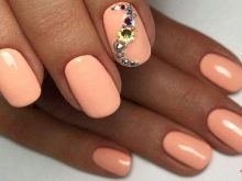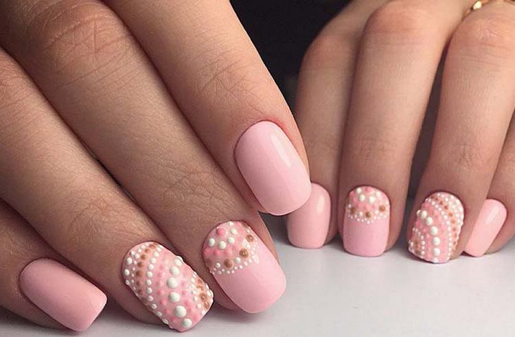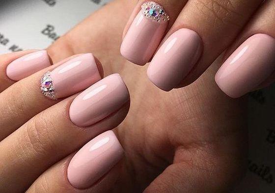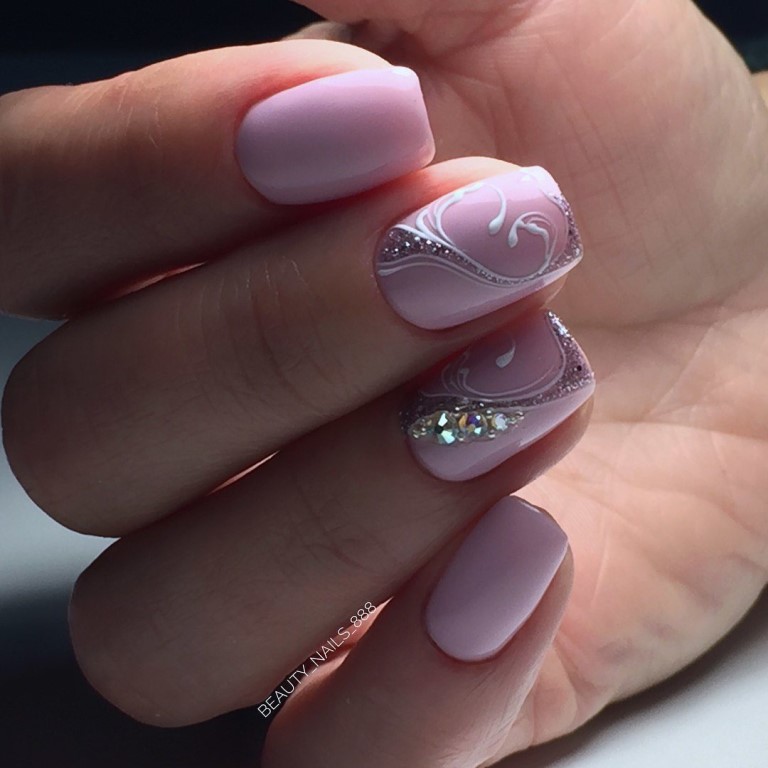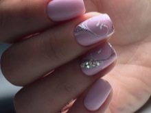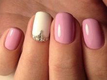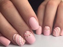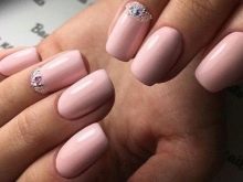 - Rhinestones and bouillon. This decorative element is able to give your nails even more tenderness. But the main thing here is not to overdo it. It is enough to decorate just a couple of fingers. Otherwise, the manicure will quickly cease to be gentle and turn into alyypisty.