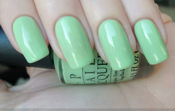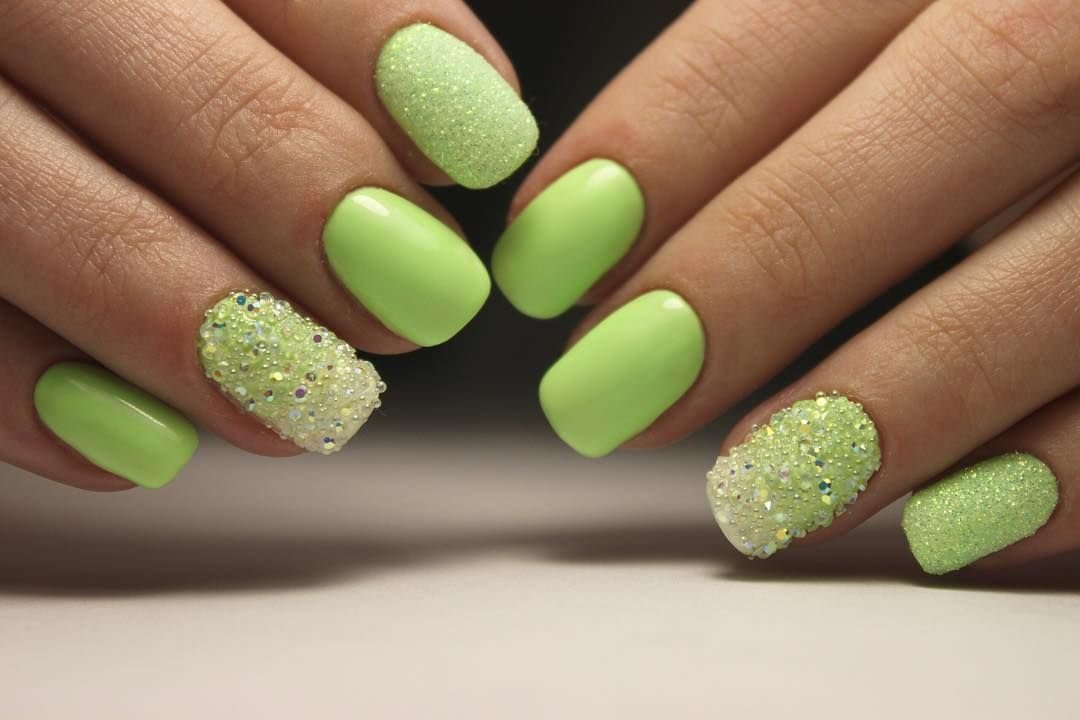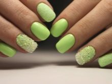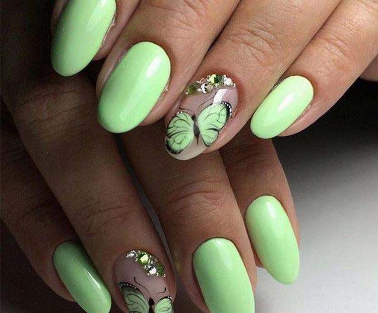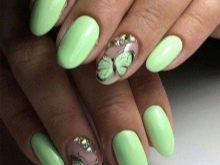 - Green. For such a gentle manicure, pale green, olive, mint, menthol shades and tea tree are suitable. It is widely known that green color can calm the psyche, to restore composure. The nails of green shades are able to connect you with nature, which is quite important in the conditions of life in the metropolis. The main thing is that this manicure is combined with your wardrobe.