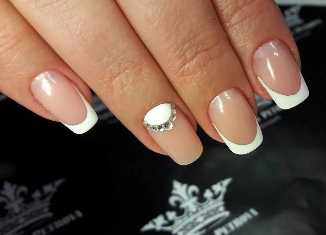 Classic French manicure is relevant at all times. To add even more tenderness to this design, you can glue some rhinestones and bouillons on just one nail.
