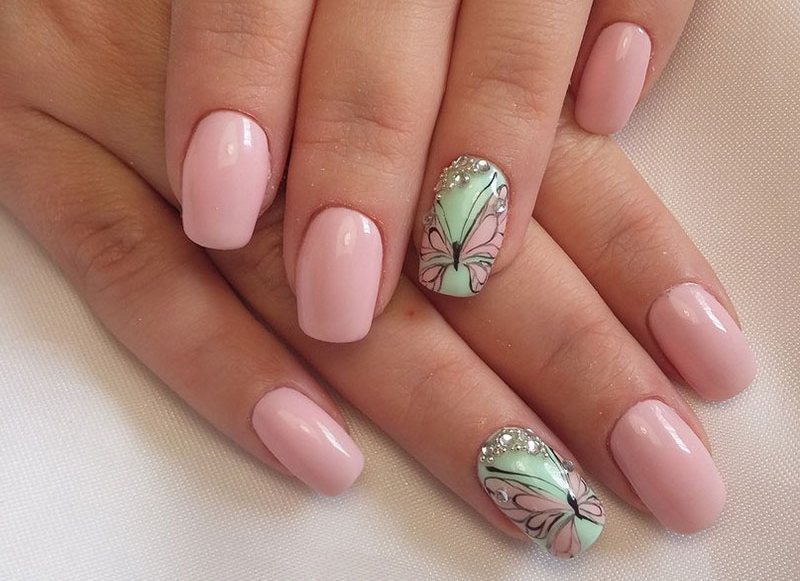 In addition, for a gentle manicure, you can pick up the stickers in soothing colors. But professionals still prefer to reproduce images with a brush. Butterflies, geometry, flowers - all this is applicable when playing manicure in delicate colors.