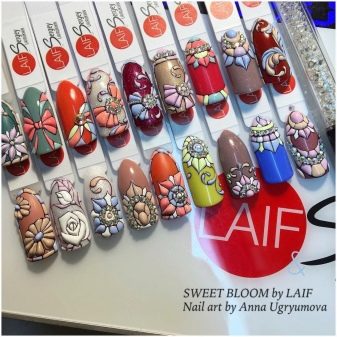 Volumetric manicure is very convenient to do exactly shellac, since the thick texture of lacquer allows you to display any pattern, keeps well and does not spread.