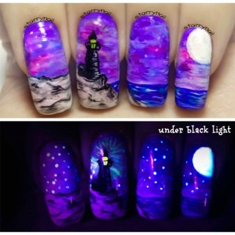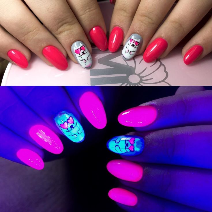 - Neon manicure is another fashionable manicure. It is carried out by special neon varnishes that glow in the dark. The design can be very different.