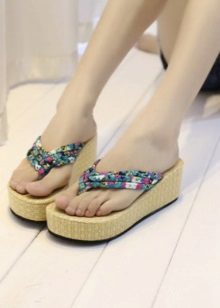 Another interesting model - slaps on cork wedges. It is also lightweight and at the same time reliable material, remarkably suitable for marine recreation. The design of such products is often very original, they can be decorated with bows and flowers, beads and rhinestones.