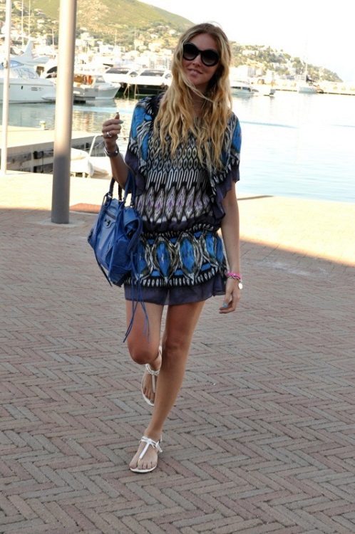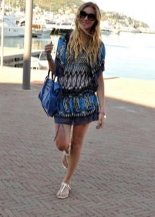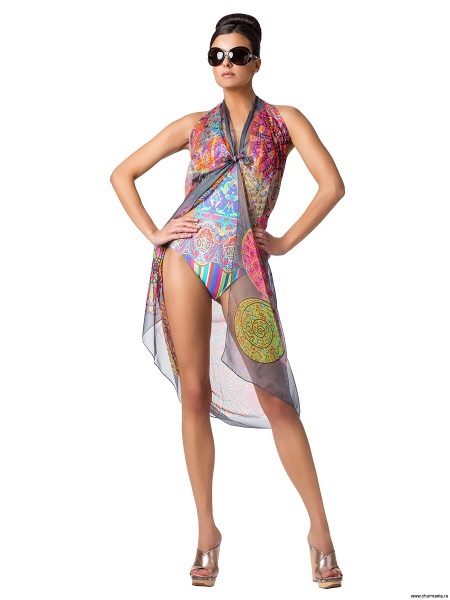 Stylish beach outfit has a motley color. Swimsuit fused style is combined with a transparent scarf-pareo of a similar color range. This ensemble harmoniously complement extravagant sabots on a platform with a high, stable heel. Their highlight in silver color, which looks especially impressive in combination with tanned skin. Such shoes make the legs longer and slender. Sunglasses and a beautiful girl's hairstyle complete this trendy summer look.