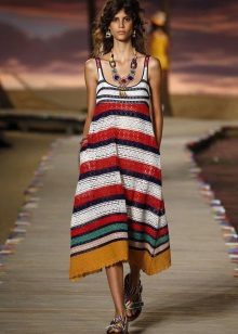 Very feminine ensemble, which is suitable not only for going to the beach, but also just for a summer walk. The long light sundress opens up the chest as much as possible and has a piquant slit in the front. The curtain on the belt emphasizes a slim waist. The perfect duet to such clothes are elegant Vietnamese. The red sole looks stylish and has something in common with the sundress pattern, and the silver rhinestones on thin straps harmonize with the girl's pedicure.
