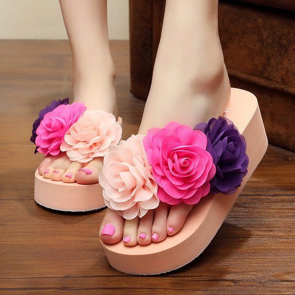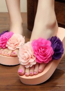 Lovers of the classics probably will not pass by a pair of light slates, decorated with bright, beautiful flowers. They can decorate the lintel, wedge or the entire model. Flowers can be bright, contrasting or made to match shoes. They can be painted or decorated with slates in the form of applications of rhinestones. This type of decor is very popular today.