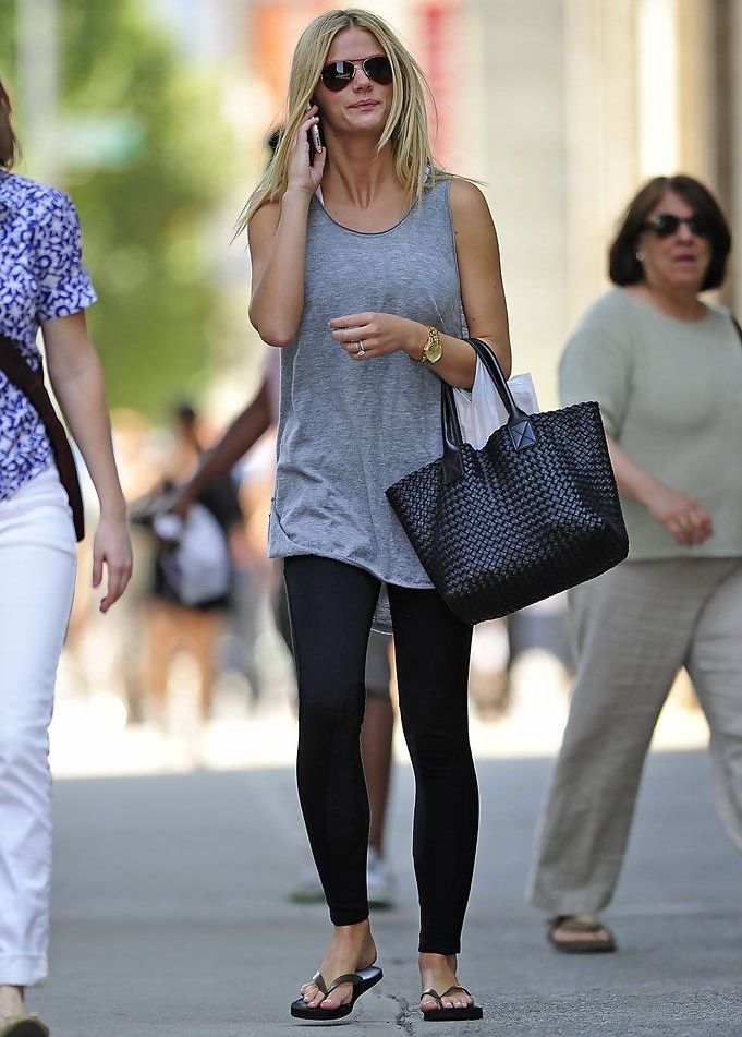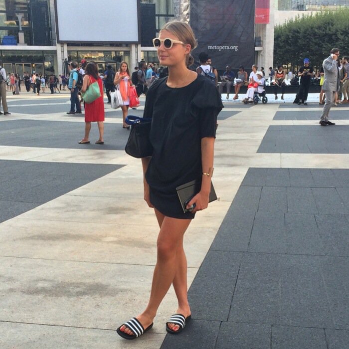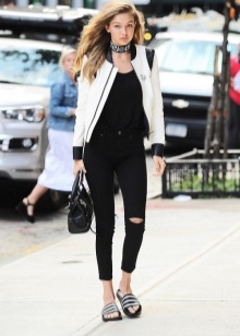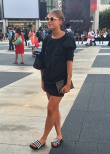 Beautiful slippers from the famous brand will look very impressive with casual summer dresses and skirts. The perfect combination is to slap with a variety of sports-style models. It is worth remembering that the slippers will open the heel, so you need to take care of a neat and beautiful pedicure in advance.