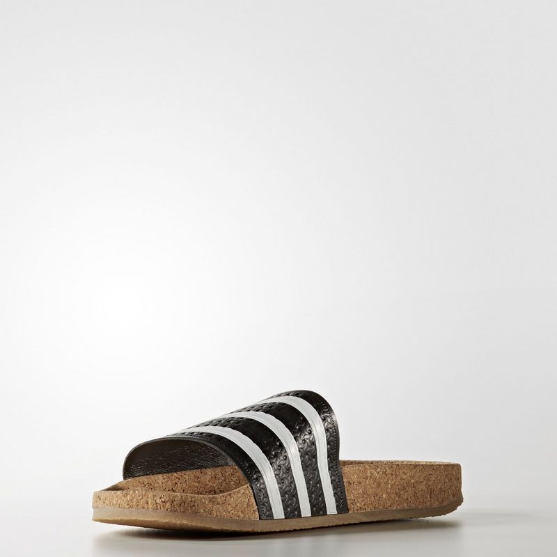 Comfortable slippers Adilette Cork have a non-slip cork sole and leather upper with three contrasting stripes. Such shoes will not allow feet to get tired even after prolonged wear in hot weather.