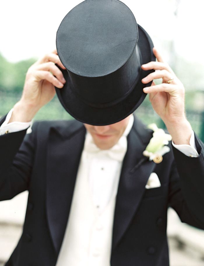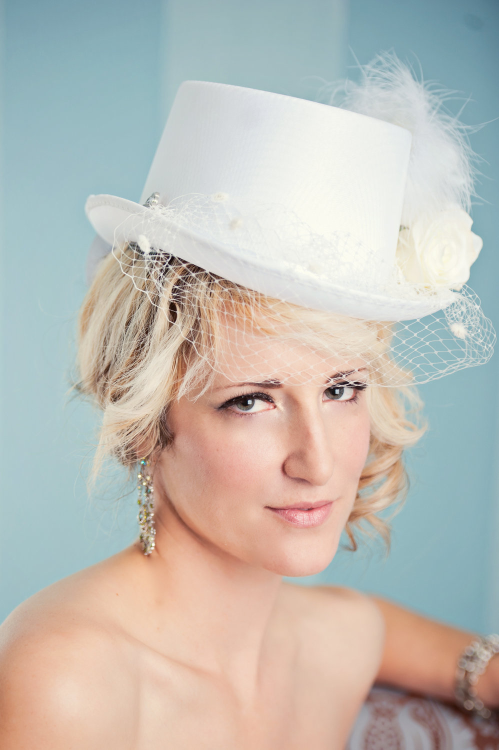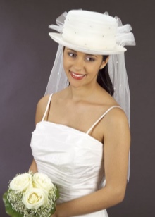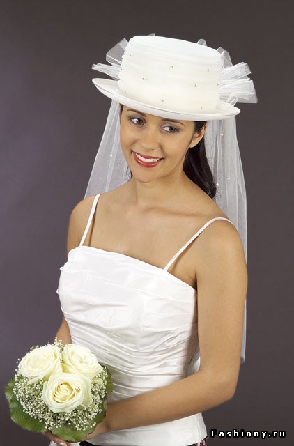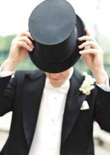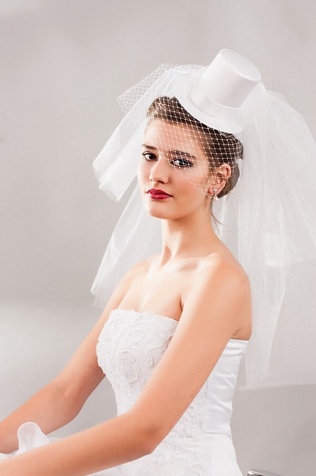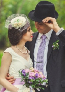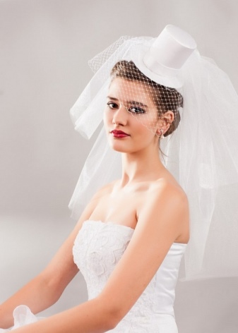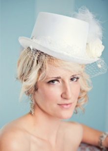 If the bride decided to wear such an original headdress, then the groom can try it on. The bride in a white top hat, the groom - in black - is the perfect alliance for a wedding celebration.