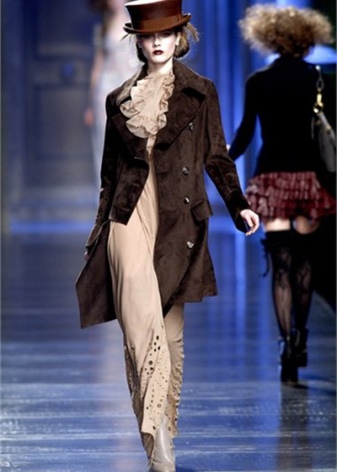 - Vintage look - like steampunk or the English era of the XIX century. This image can be created with the help of a dark-colored velvet coat with large buttons and a dress or a light-colored blouse with a frill collar. Complementary to the blouse can be strict trousers with a high waist or black pencil skirt. Despite its extravagance, this outfit can be used in everyday life.