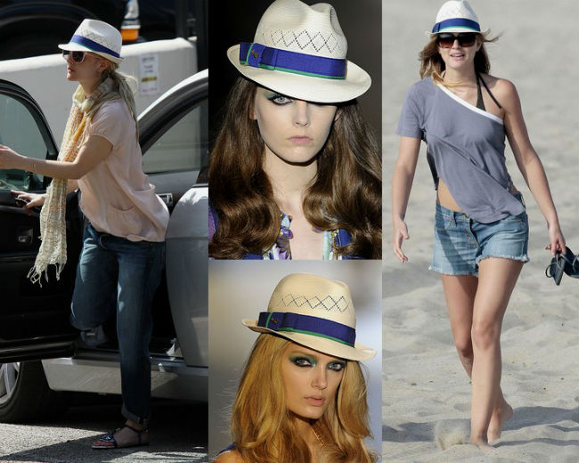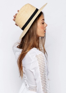 More recently, the hat was supplemented exclusively with satin or silk ribbon between the crown and the fields. Fashionable products from modern designers are equipped with not only the usual details, but also leather braids, decorative stones and contrasting ribbons with geometric prints.