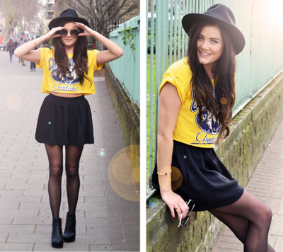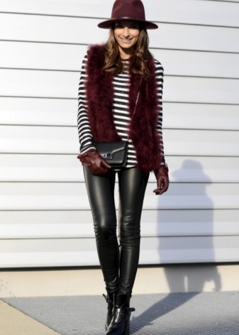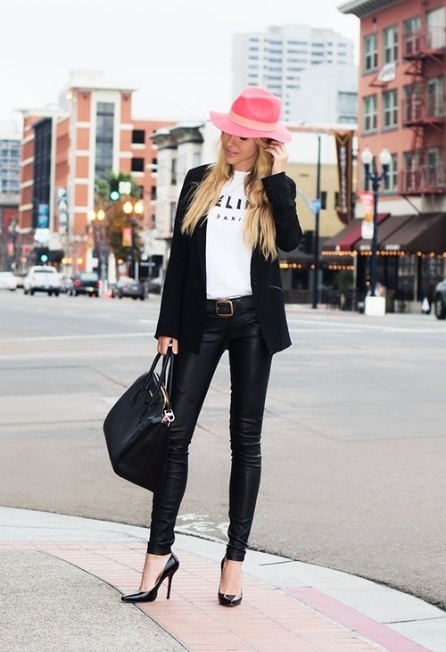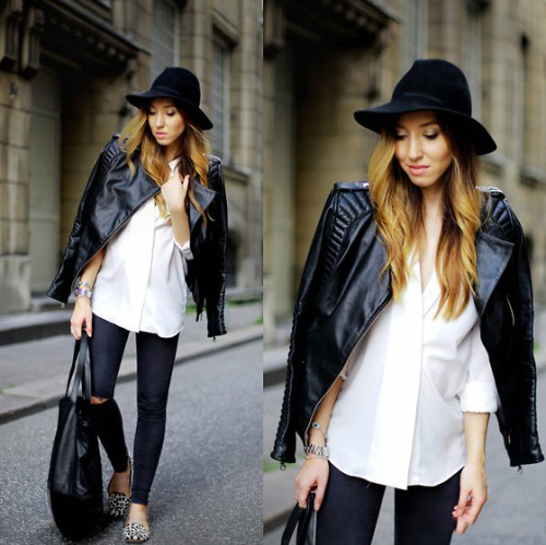 Classic black leggings, an elongated white tunic and a bright fedora hat with a contrast ribbon look spectacular and sexy.