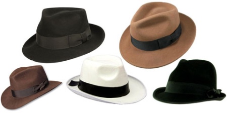 The original hat was made of velvety felt and framed with a satin ribbon. A little later, the accessory began to create from a variety of materials. Only the style did not change: narrow margins that could be lifted or lowered and three dents on the upper part framing the head (crown).