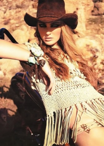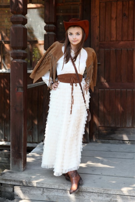 - The airy and gentle look will create a straight dress to the floor, complemented by a loose velvety fringed jacket. In this ensemble, a felt hat of mahogany color, a wide belt in color, a small bag over the shoulder and boots with a steady heel will look perfect. This set carries the true spirit of the Wild West, which is sure to attract the attention of others on the street.