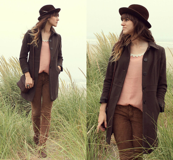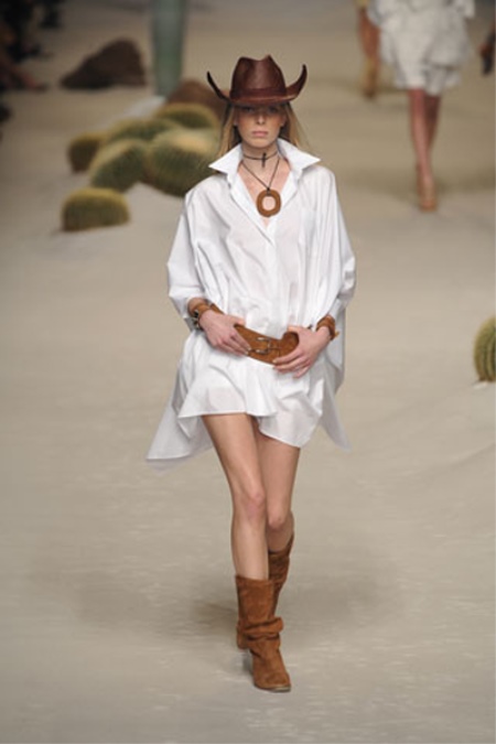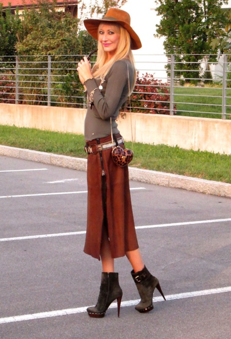 - To emphasize beautiful and slender legs, you can use an elongated light shirt with a wide brown belt. Under such spacious clothing fit dark brown cowboy hat and suede boots of medium length. You can add a bold image with a large pendant in the color of a hat.