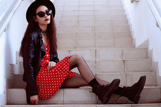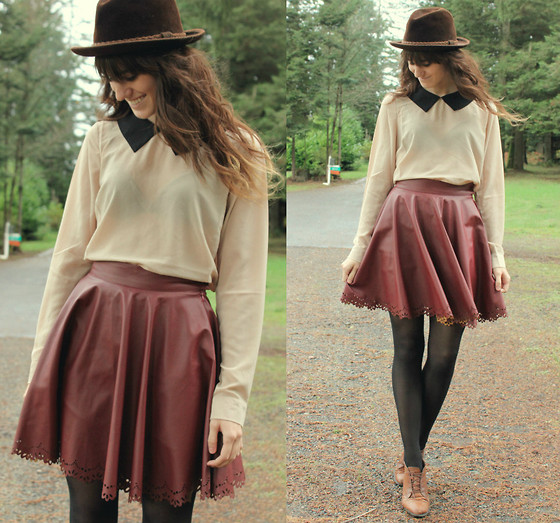 - A set of a red or burgundy skirt below the knee, a neutral gray blouse and a wide-brimmed hat in the color of the skirt will look very bright and saturated on the lady. Feminine high-heeled booties will look perfect with this tandem. You can complement the image with a miniature handbag on a strap-chain, a light belt at the waist and a narrow bracelet.