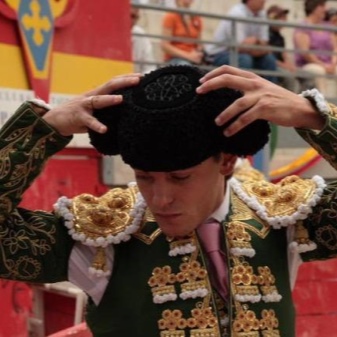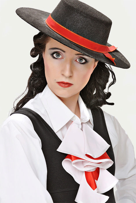 A luxurious black hat with a wide brim and a red satin ribbon wrapped around the crown is certainly one of the main decorations of the traditional Spanish costume. Gold cord, decorating the field, gives the headdress even more elegance and dignity.