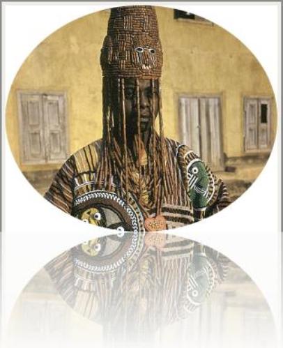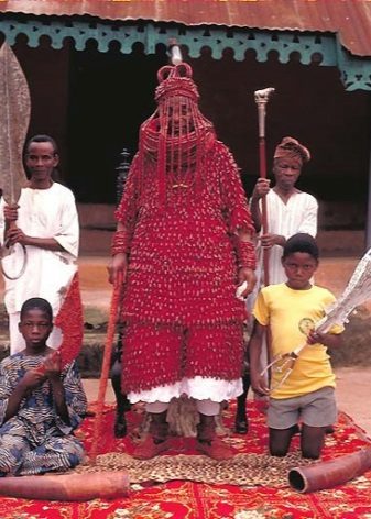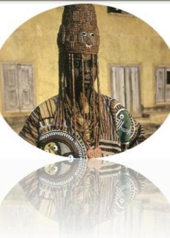 The traditional headdress of the leaders of the tribes of Nigeria is a huge crown, decorated with beads. It is decorated with figures of animals, birds and people made of beads. A thick veil covering the face of the leader is also created from several thin bead pendants.