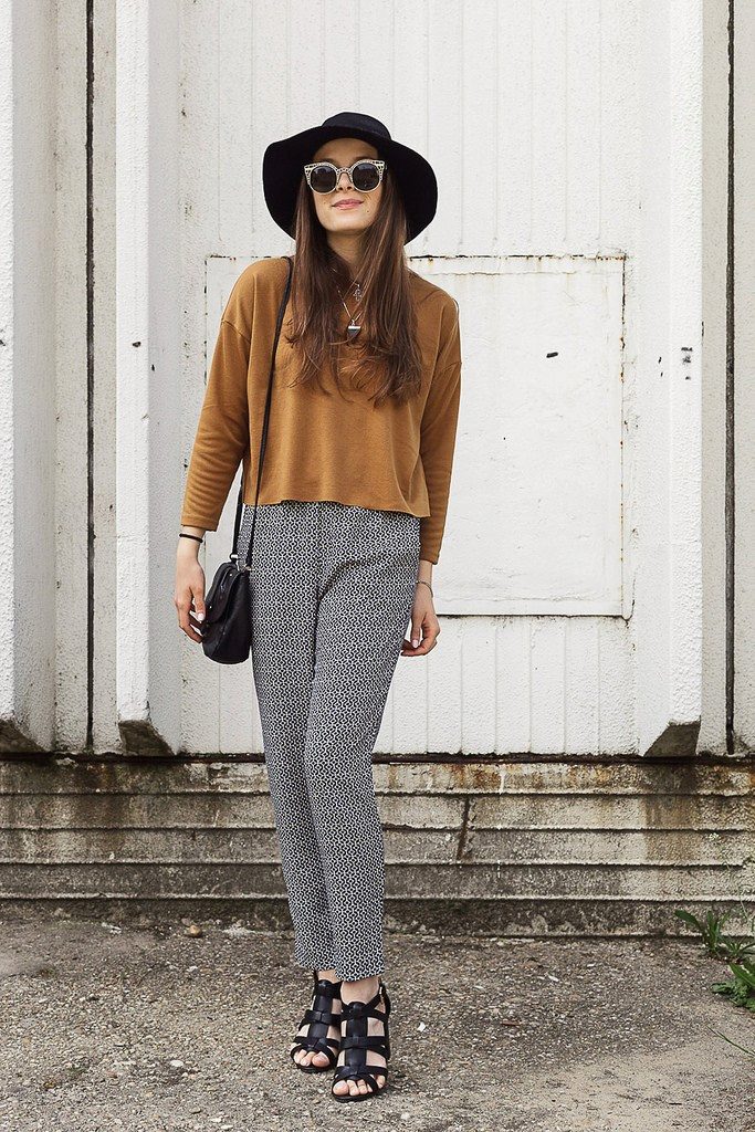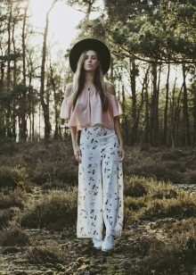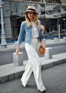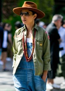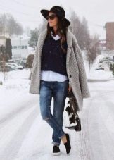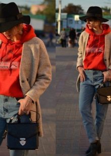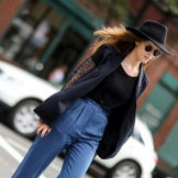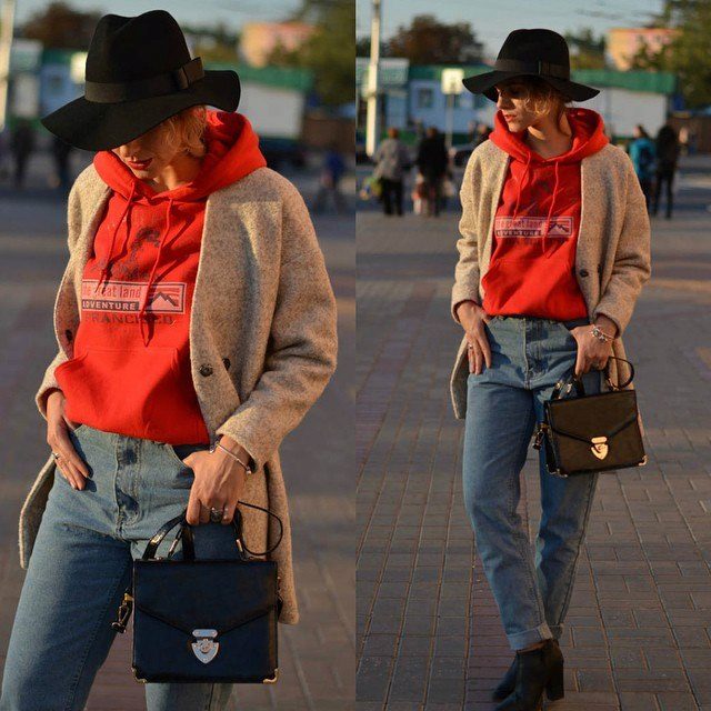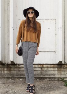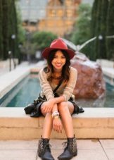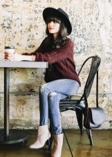 - With jeans or trousers. If it's warm outside, wear a hat with a stylish jumper or sweatshirt and narrowed boyfriend pants or jeans. Sneakers or ankle boots with thick heels will help to complement the image.