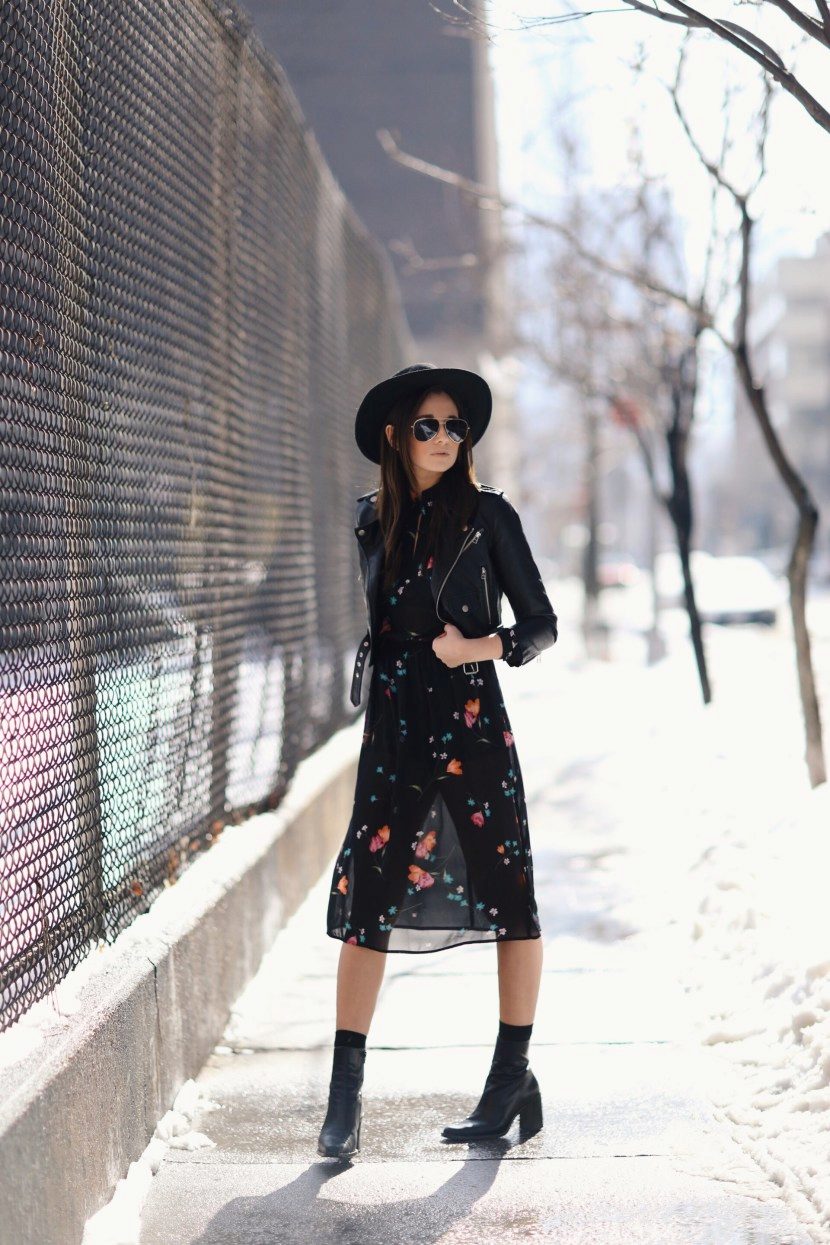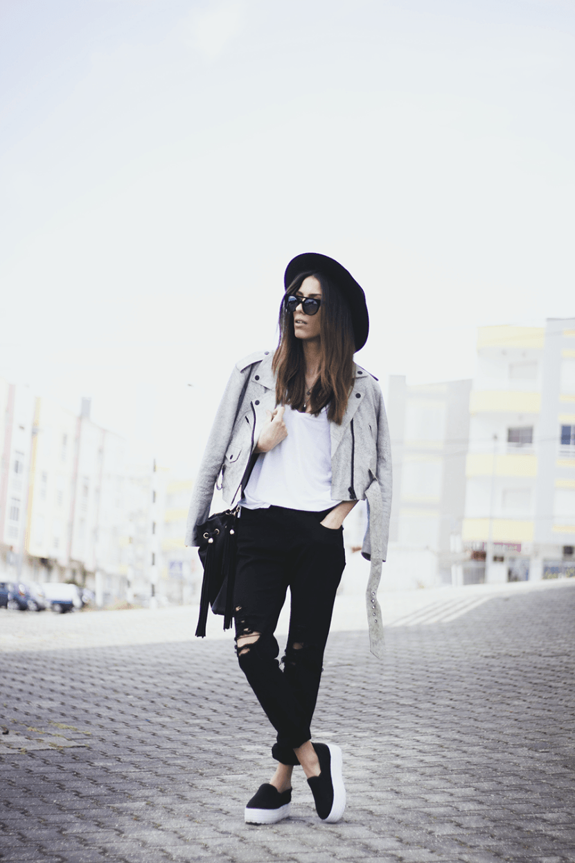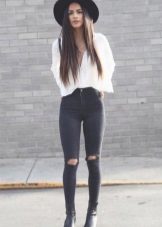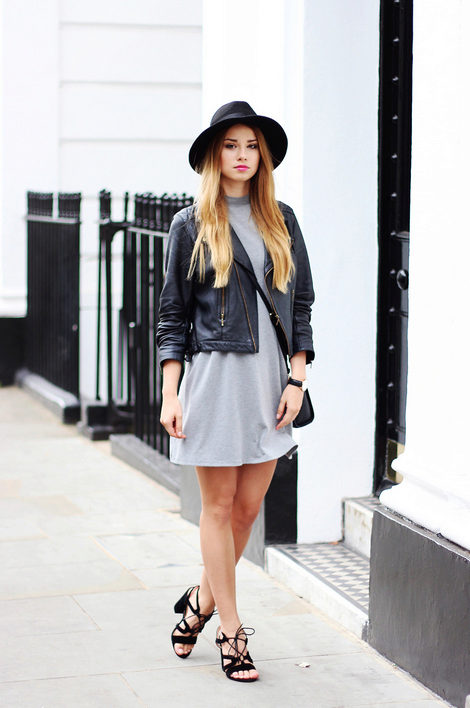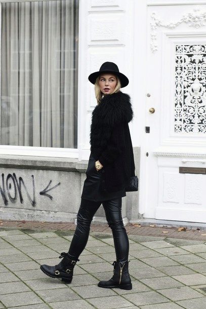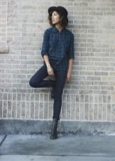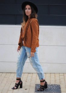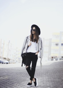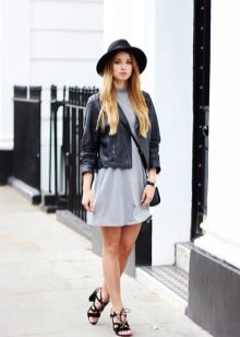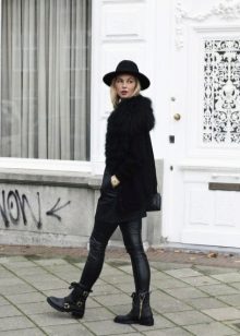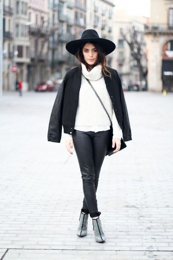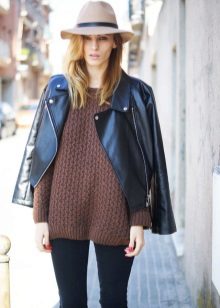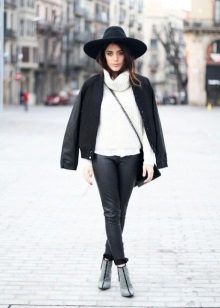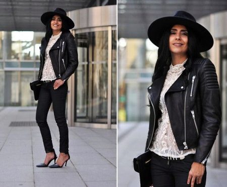 - With a leather jacket. A jacket-jacket can be worn with a wide-brimmed hat, without risking to look like a biker. To do this, wear it with skintight jeans, a stylish jumper and ankle boots with heels. Do not forget about the laconic decorations that will be the final touch to your image.