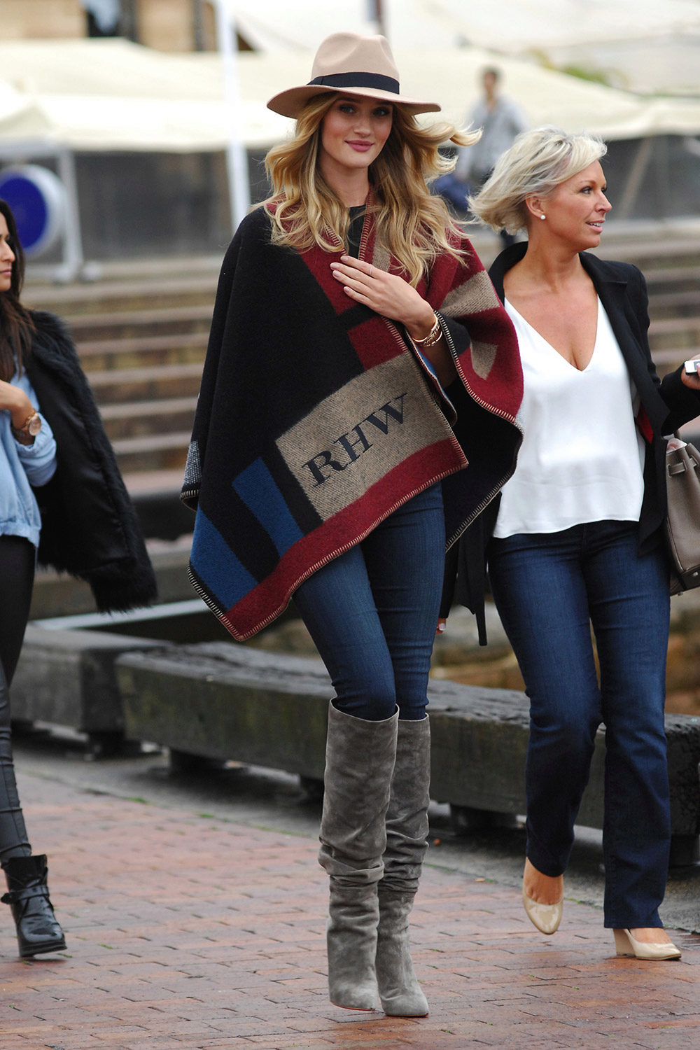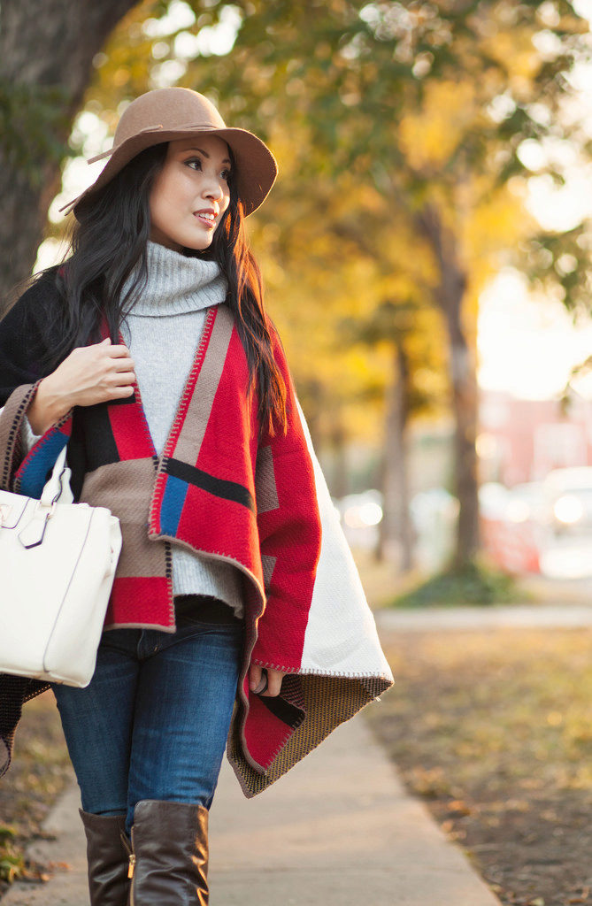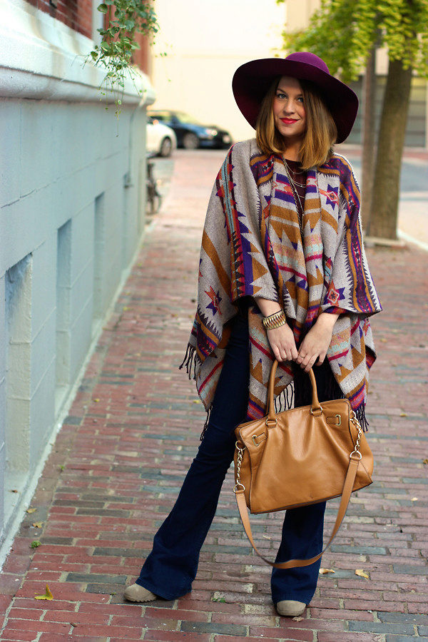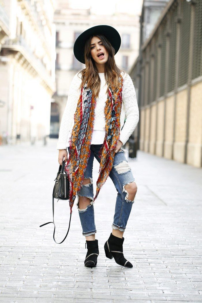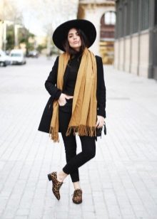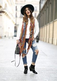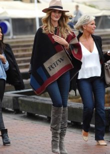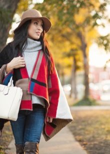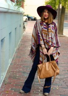 - With a poncho. Even on a cold day, you can look stylish, wearing a voluminous poncho with tight pants, and complementing your look with a wide-brimmed dark hat. The final touch of the image will be a capacious leather bag with short handles.