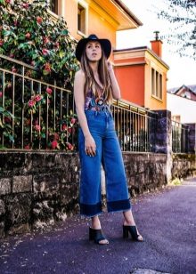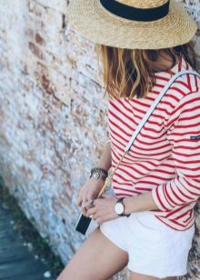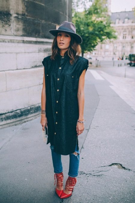 - For a stylish avant-garde look, wear a long sleeveless shirt with narrow cropped jeans. Complement your look with red pumps with lacing and gray felt hat. Do not forget about a small clutch and concise bracelets on the wrists. This outfit is suitable for going to the cinema, meeting with girlfriends or a fashionable party.