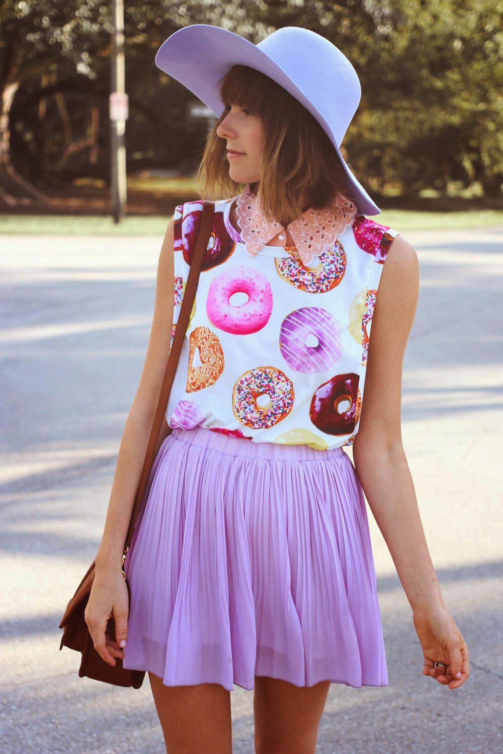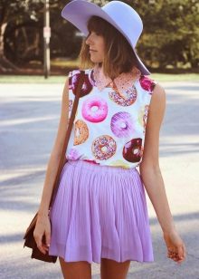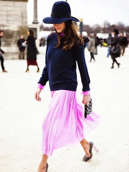 - Go on a date? Put on a light purple dress with a pleated skirt, on top - a dark blue jumper, complement the image with shoes with a thick heel and a small clutch. The final touch of the image will be a wide-brimmed hat to match with a jumper.